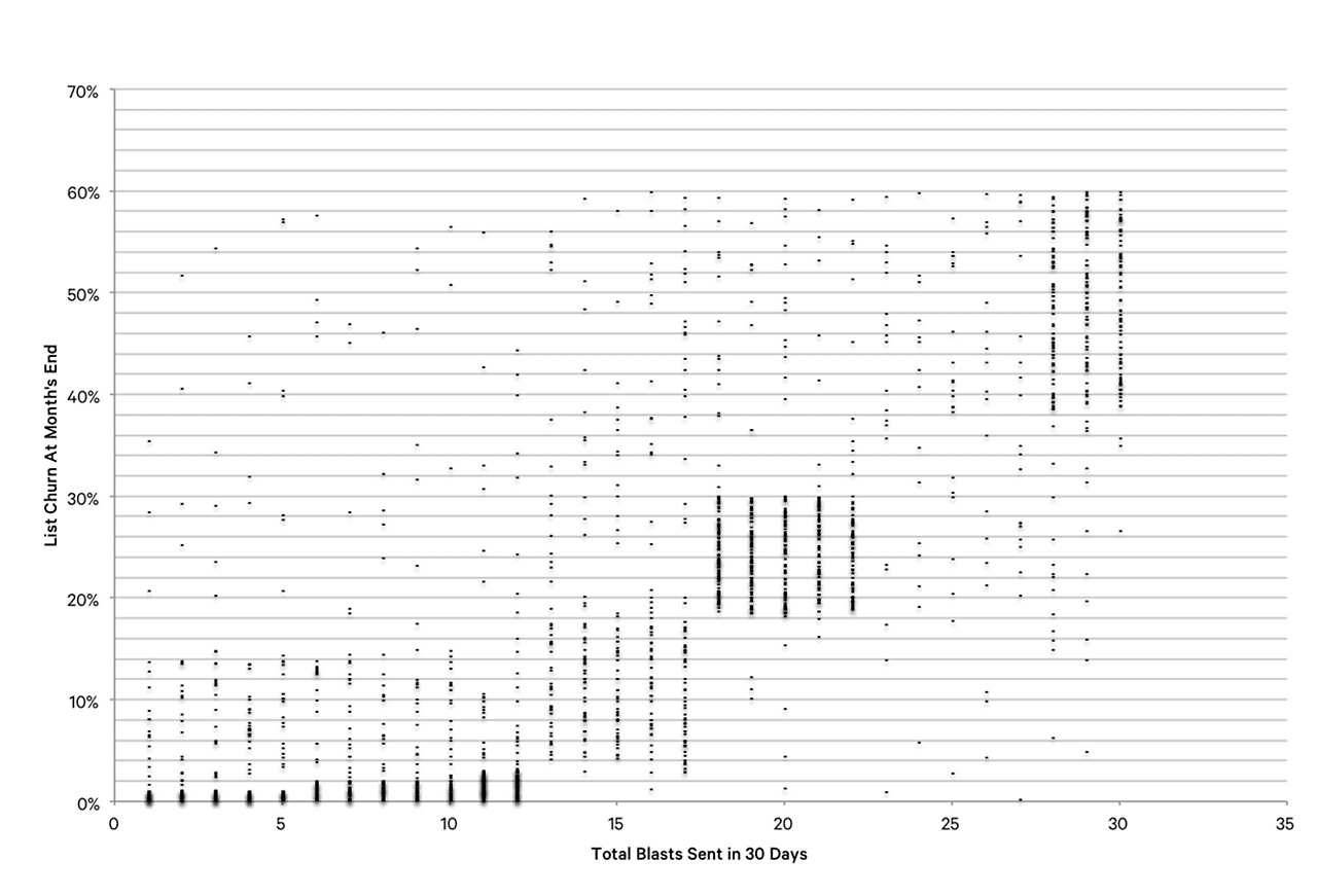 아래의 그래프는 30일동안 발송한 총 SMS 메세지 수에 따라서 월말 구독 취소율이 어떻게 나타내는지 보여주는 그래프입니다.
