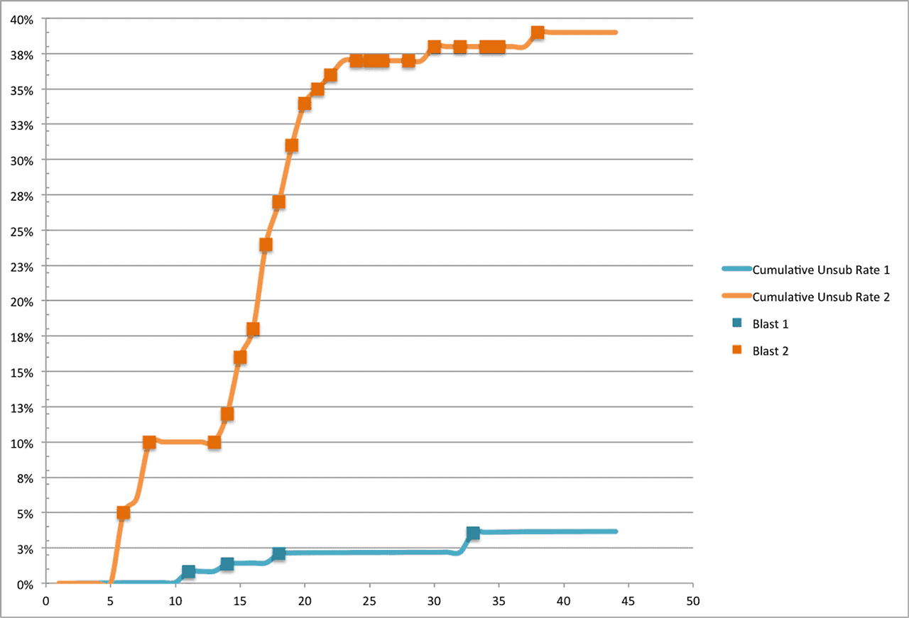 Orage가 메세지를 보낼 때마다 구독 취소율이 증가한 것을 확인할 수 있습니다. 반면 Blue가 메세지를 보낼 때는 구독 취소율이 크게 증가하지 않습니다.