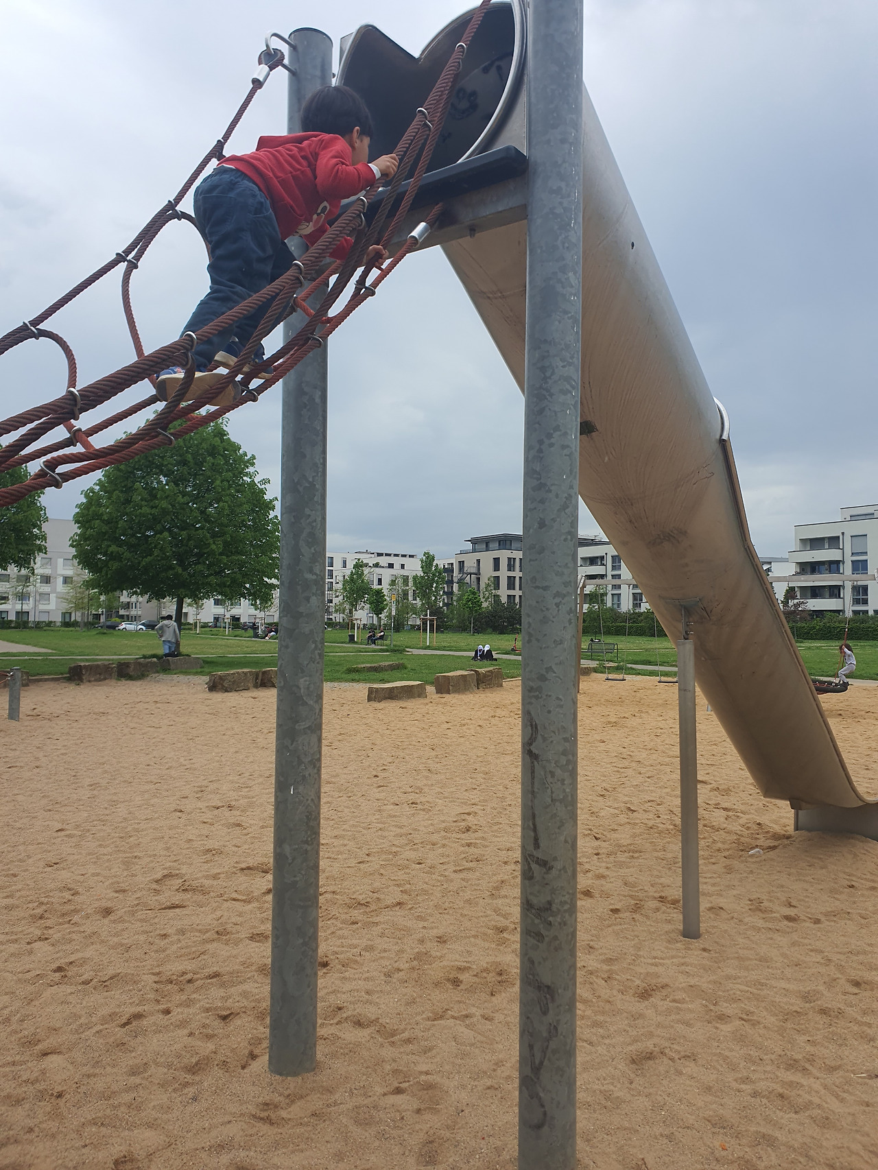 나오는 길에 커다란 놀이터가 보였다. 3미터는 족히 되는 높이에 계단도 없이 그물로만 올라갈 수 있는 미끄럼틀이 보였다. 아이가 전속력으로 달려갔다. 처음에는 못하겠다더니 끝까지 올라가서 미끄럼틀을 타고 내려왔다. 그러다 또래 아이들을 만나서 신발을 벗고 이번엔 미끄럼틀을 거꾸로 올라갔다. 비도 조금씩 내리는데 집에 가는 애들이 없었다. 아이는 머리부터 발끝까지 모래가 묻었다.