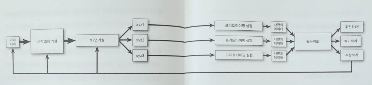 48. '전략 2. 내일보다는 오늘 테스트하는 게 낫다.' 테스트를 미루지 마라. 여러분의 아이디어(와 엉덩이)를 생각랜드에서 끄집어내어 최대한 빨리 시장으로 가져가라. 첫 시장 호응 가설을 정하고, XYZ가설 형식으로 표현하고, 범위 축소를 통해 xyz 가설로 좁히고 프리토타이핑 실험을 설계했다면, 이제는 추상적 사고에서 구체적 테스트로 이동할 때다.