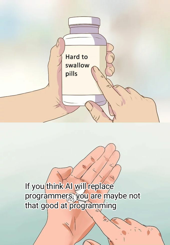 내가 대체될지 모른다는 불안감은 분야를 막론하고 모두에게 존재합니다. 아래는 미국의 개발자들 사이에서 유행하는 짤이라고 하는데, 내용은 대충 이렇습니다 : 삼키기 힘든 약(매트리스의 빨간 약 비유) 당신이 인공지능에게 대체될 거라고 생각한다면, 당신은 개발을 잘하지 못하는 것일 확률이 크다.