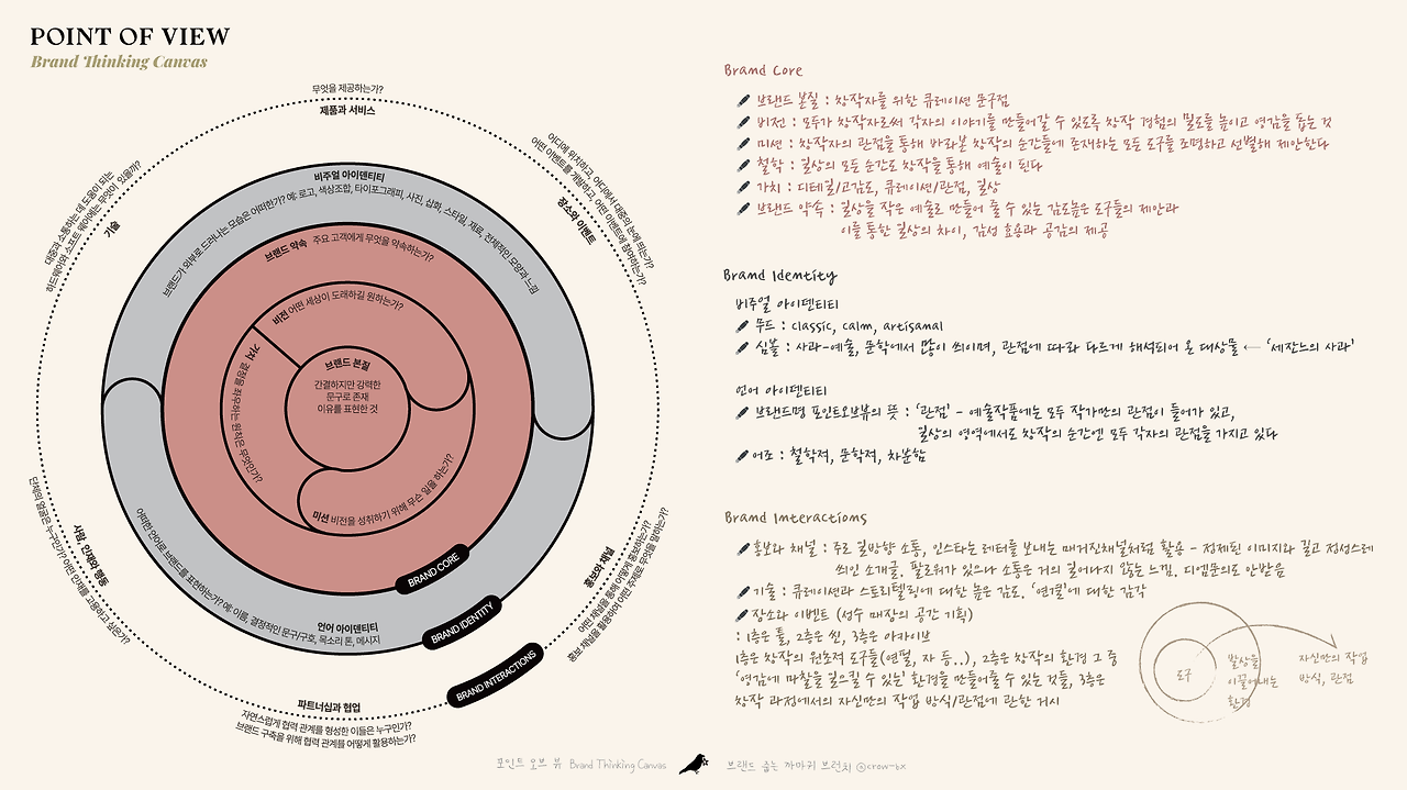 브랜드 기획자로써 스몰브랜드를 조사할 때 사용해 보는 프레임워크가 있다. Brand Thinking Canvas 프레임이라는 건데, 포인트오브뷰는 이 프레임을 채워보는 과정이 굉장히 수월했다. 특히 '브랜드 본질' 영역에 있는 항목들이 어려움 없이 모두 채워지는 것을 보고 이 브랜드는 역시 기획자가 온전하게 (클라이언트의 방해를 받지 않고) 만들었구나' 하는 인상을 다시 한번 받았다.