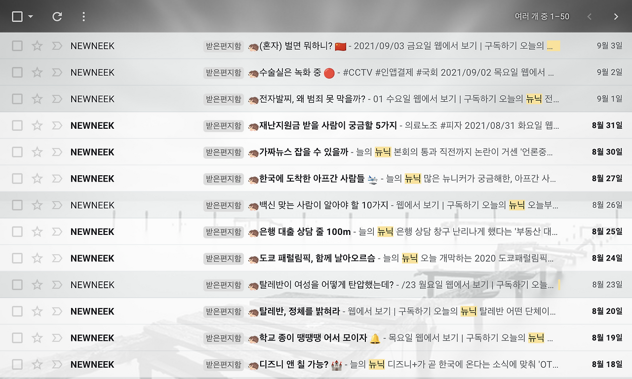 메일 제목에도 항상 고슴도치 이모지를 써서, 매일 아침 제 메일함에 작은 고슴도치가 도착합니다. 그리고 친근한 말투 덕에 메일 알람을 얼핏 보기만 해도 뉴닉 레터인 걸 알 수 있어요.