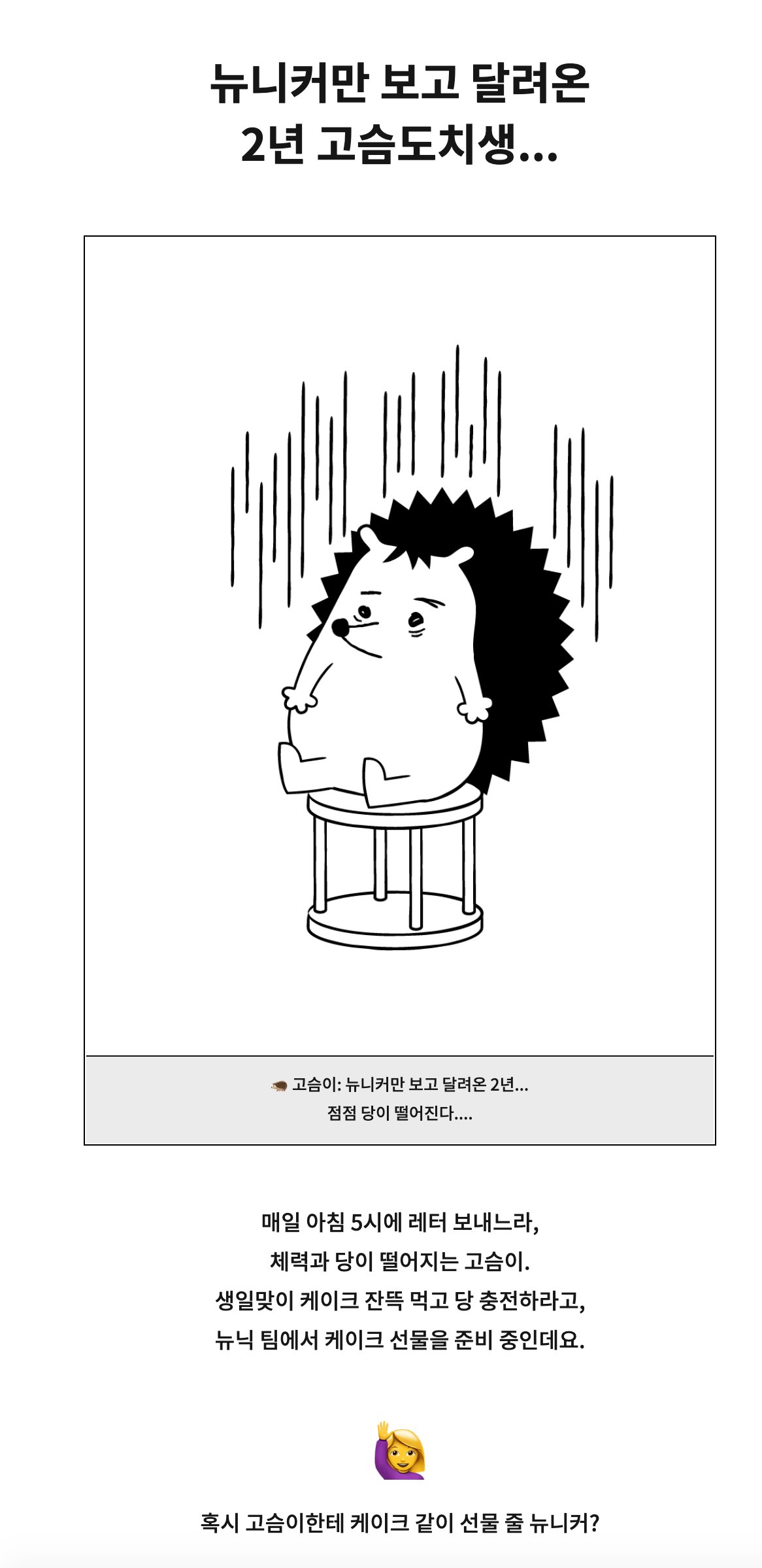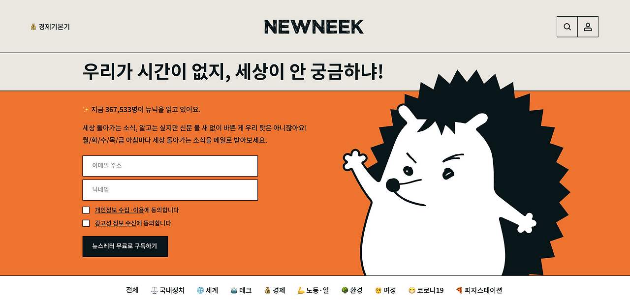 뉴닉은 "우리가 시간이 없지, 세상이 안궁금하냐!" 라는 슬로건으로 뉴스를 요약,정리 & 떠먹여주는 뉴스레터를 보내줍니다. 뉴닉의 브랜드 페르소나는 무려 고슴도치.. 로 꽤 독특하면서도 친근한 페르소나를 설정하고 있고, 말투와 슬로건에서도 독특함과 친근함이 잘 드러납니다.