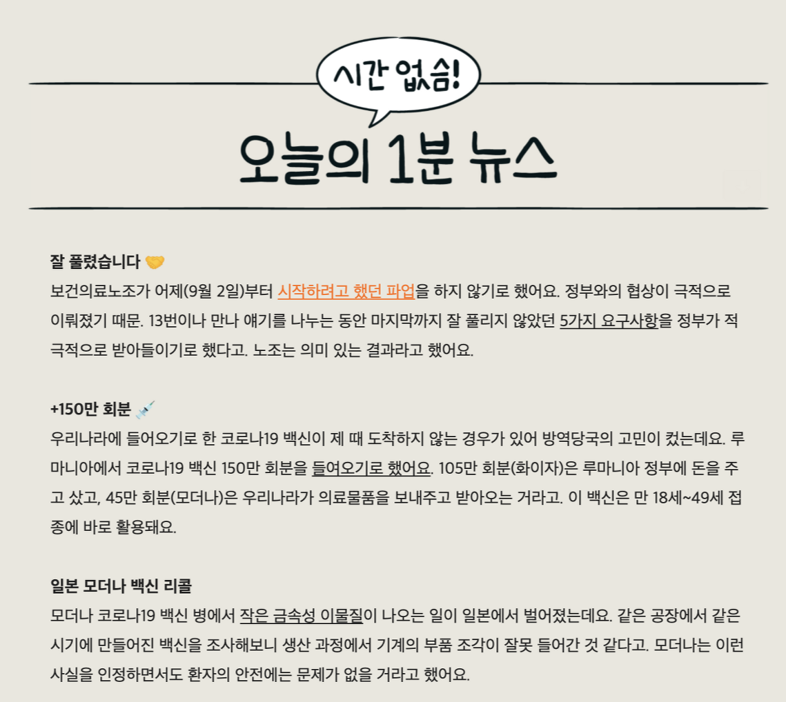 뉴닉이라는 시사 뉴스레터 서비스인데, 이 아티클을 교재로 삼았던 건 아닐까 싶을 정도로 위에서 이야기한 내용들이 모두 잘 맞는 '모범 사례' 입니다. 말투가 충분히 독특하고, 디테일을 잘 설정해서 지켜나가고 있는 서비스이고, 저도 이 브랜드의 팬이기도 합니다.