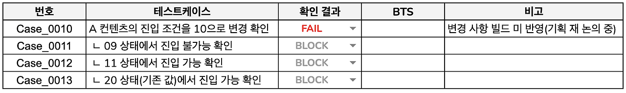 위의 예시처럼 Block을 사용하여 Fail 케이스에 의해 테스트가 막힌(Blocking) 케이스를 구분합니다.