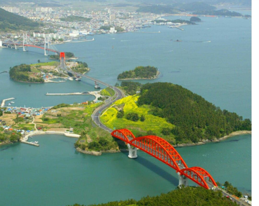 삼천포의 맨 서쪽 편에는 육지와 남해섬을 연결하는 삼천포대교가 시원스럽게 놓여 있다. 이 다리는 3개의 섬을 5개의 교량으로 잇는 것으로, 그 형식과 모양도 각기 다르다. 아치교, 사장교 등 각각의 모양은 마치 교량 박물관을 보는 듯하다. 이 다리 길은 지난 2006년 건설교통부의 ‘한국의 아름다운 길 100선 대상’에 선정되기도 하였다. 옛날, 멸치 사러 미조항으로 가기 위해 카페리에 승용차를 싣고 건너던 바닷길 대신, 이제는 시원하게 뚫린 이 다리 길을 타고 불과 몇 분 만에 건너게 되었다.
