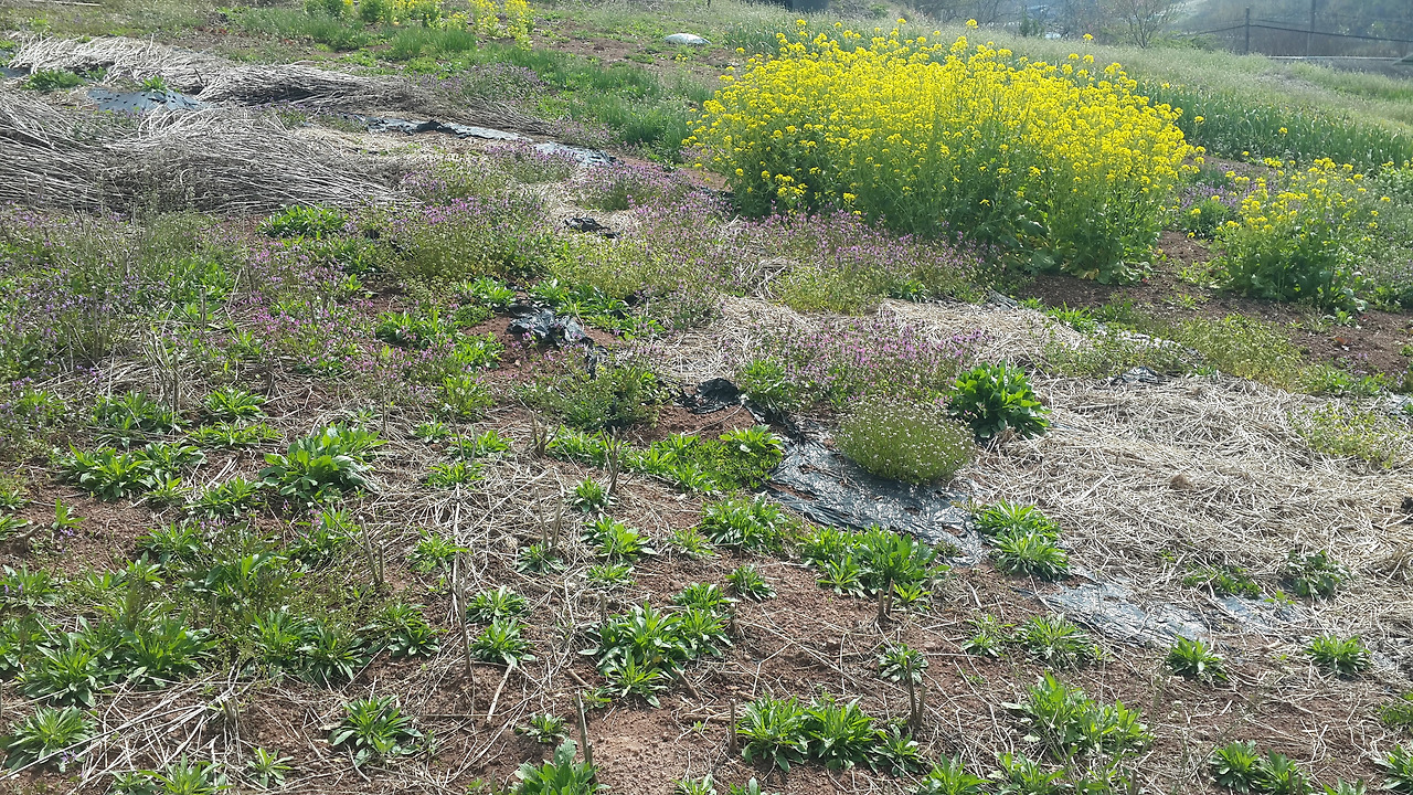 깨끗하게 정리된 우리네 텃밭과는 달리, 이웃집 앞에 펼쳐져 있는 밭에는 온갖 잡초들이 자라나고 있다. 곳곳에 솟아난 광대나물은 봄을 맞아 붉은색 꽃을 화려하게 피웠다. 그 옛날 배고플 적, 허기진 배를 채워주던 이 식물은 꽃잎이 코딱지같이 생겼다고 하여 코딱지 나물로 불리었다. 길쭉하게 자라난 냉이 줄기의 꼭대기에 매달린 하얀 냉이꽃이 봄바람에 춤추듯 하늘거린다.
