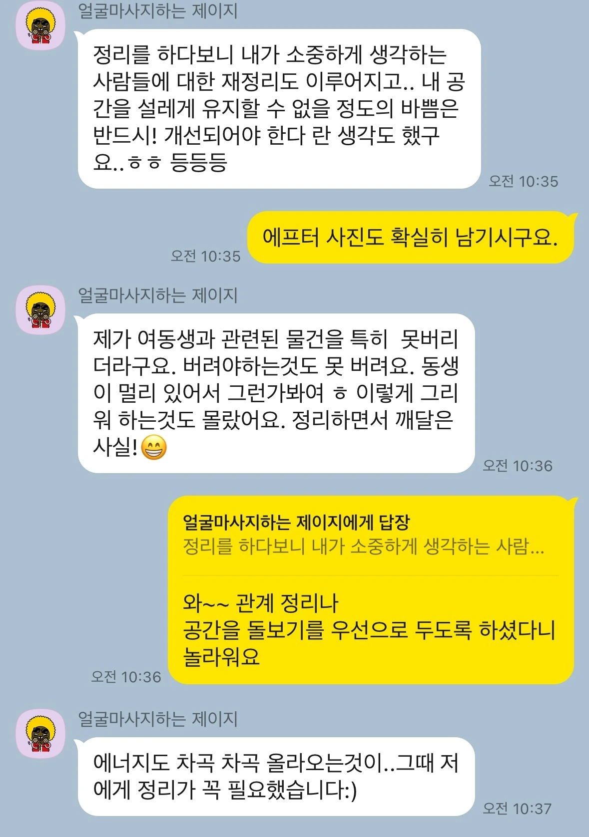 나 또한 비우는 옷들 중에 언니와 관련된 물건들이 많았다. 내 경우는 언니가 쓰고 줬거나, 버리려고 하니까 아까워서 가져온 것들이었다. 정리 축제를 하면서 정신적, 물리적으로든 너무 의지하고 있었다는 것을 깨달았다. 그래서 심리적 거리를 두고 관계를 더 소중히 하게 됐다.