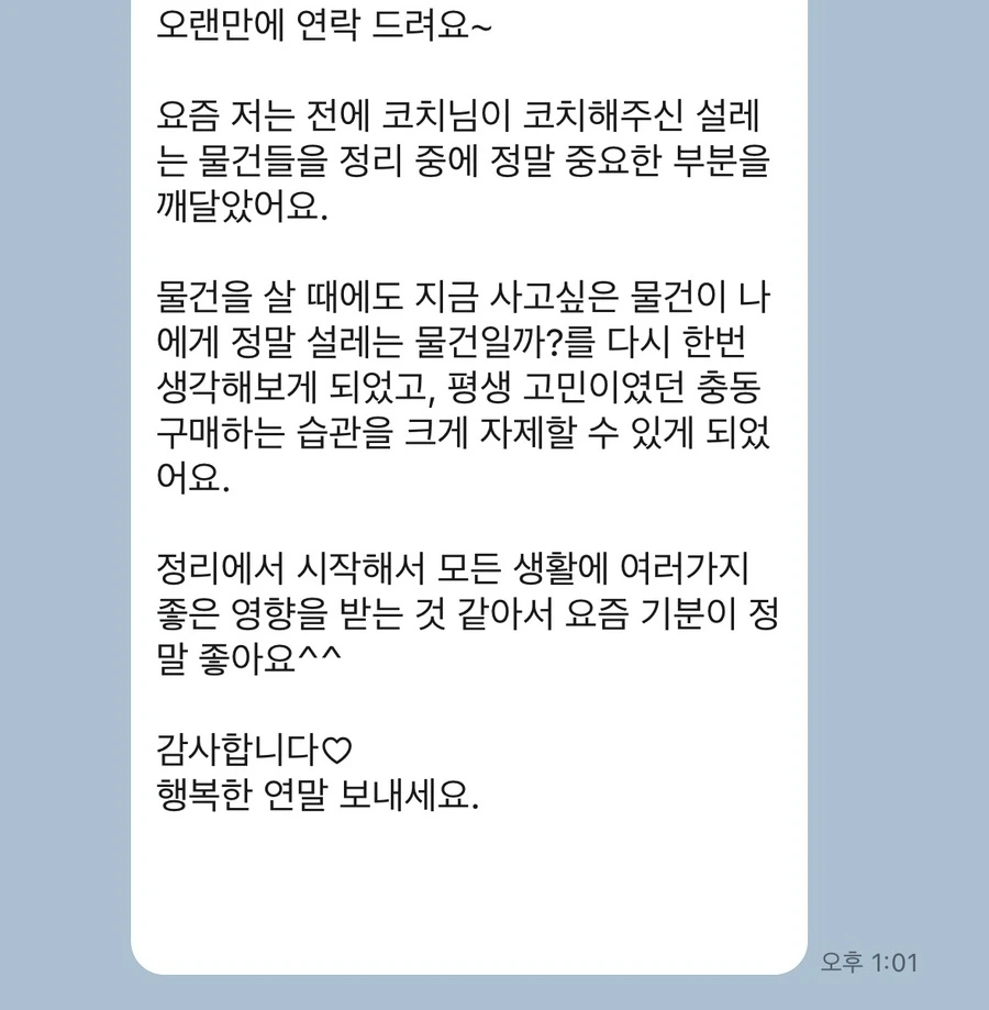 인터넷 쇼핑하다가 괜찮은 물건이 있으면 바로 사는 습관이 있었던 D님이었다. 하지만 정리에서 시작해서 모든 생활에 여러 가지 좋은 영향을 받는 것 같아 기분이 좋다고 하셨다.