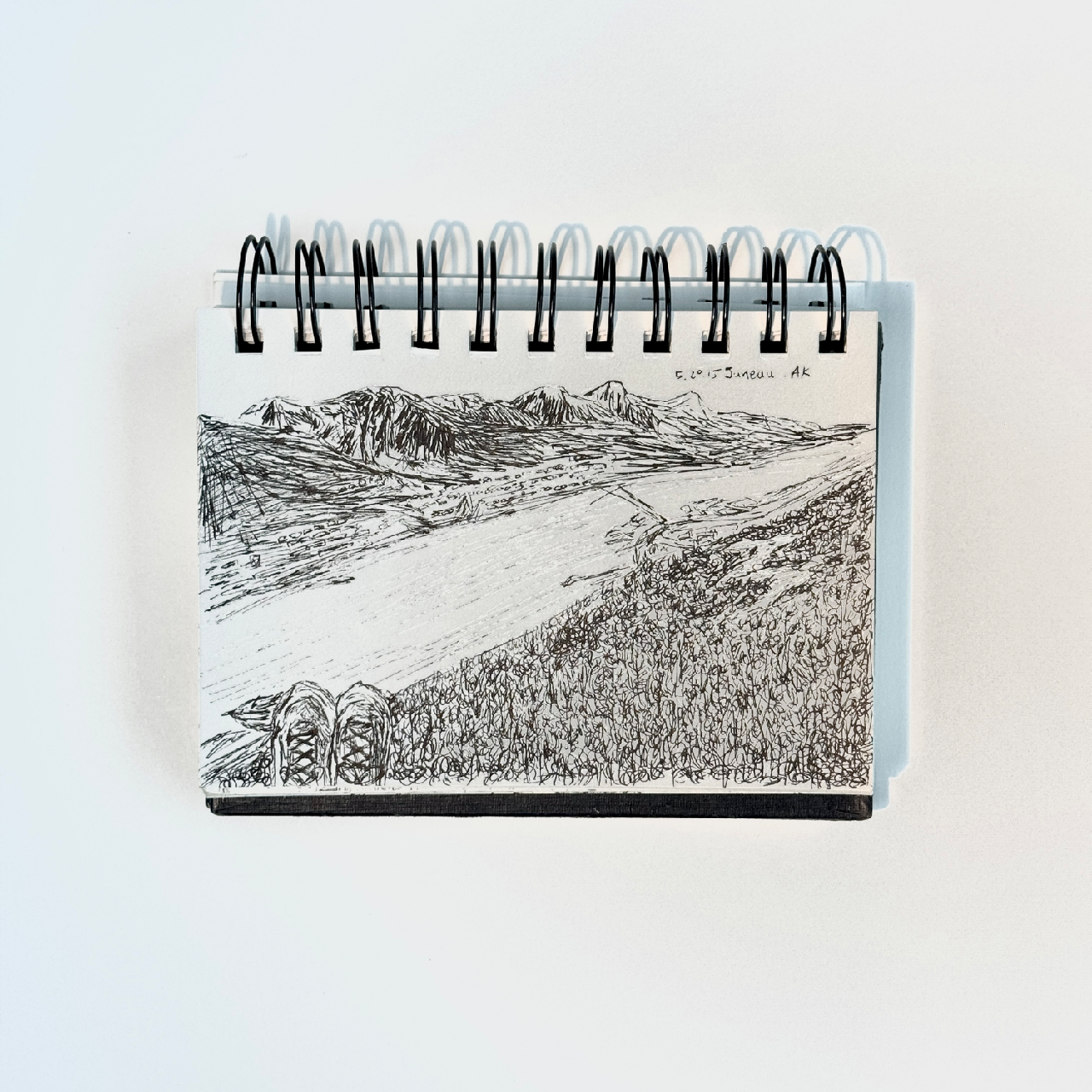친구들과 함께 부지런히 이동해야 했을뿐더러 빽빽한 숲과 웅장한 능선을 짧은 시간 안에 스케치로 표현하기엔 역부족이라고 느꼈기 때문이다. 하지만 그때의 감동을 기억하고자 내 운동화가 빼꼼 출연한 풍경 사진을 뒤늦게 스케치로 옮겼다.
