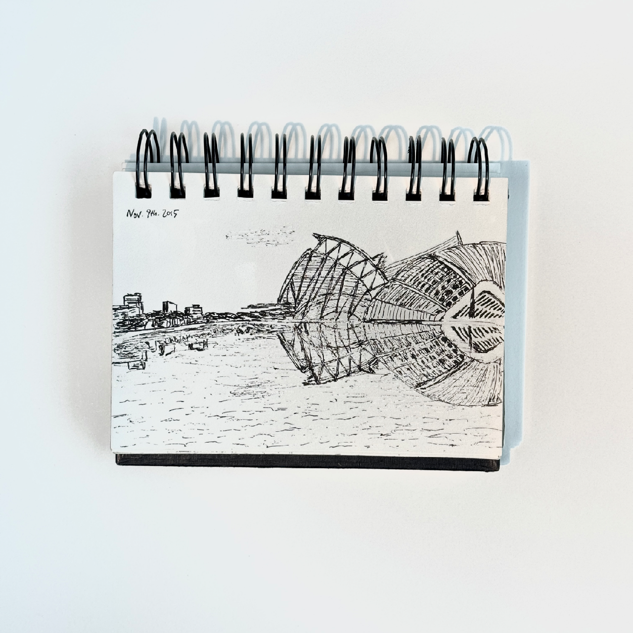 우두커니 서서 펜을 움직이고 있으니, 지나가던 친구들이 쥬디 여기서 뭐 하냐며 기웃거리기도 했다. 연습실 버블의 답답한 공기를 벗어나 발렌시아의 파스텔톤 공기를 마시며 그린 그림. 나의 발렌시아 첫 스케치는 그렇게 11월의 어느 오후에 완성되었다.