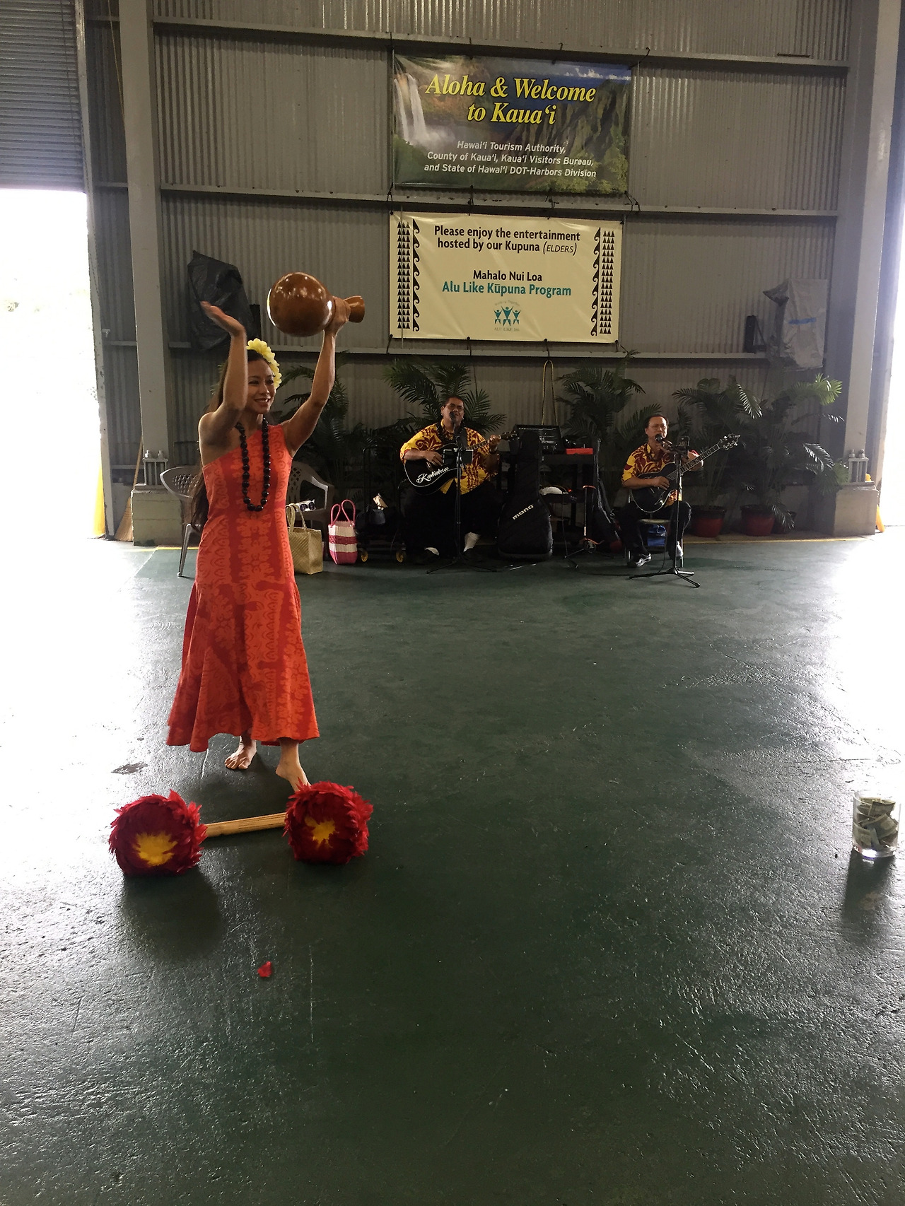 크루즈에서 내리자마자 하와이안 악단과 댄서가 춤으로 환영해 줬다. 리얼 훌라훌라춤!!