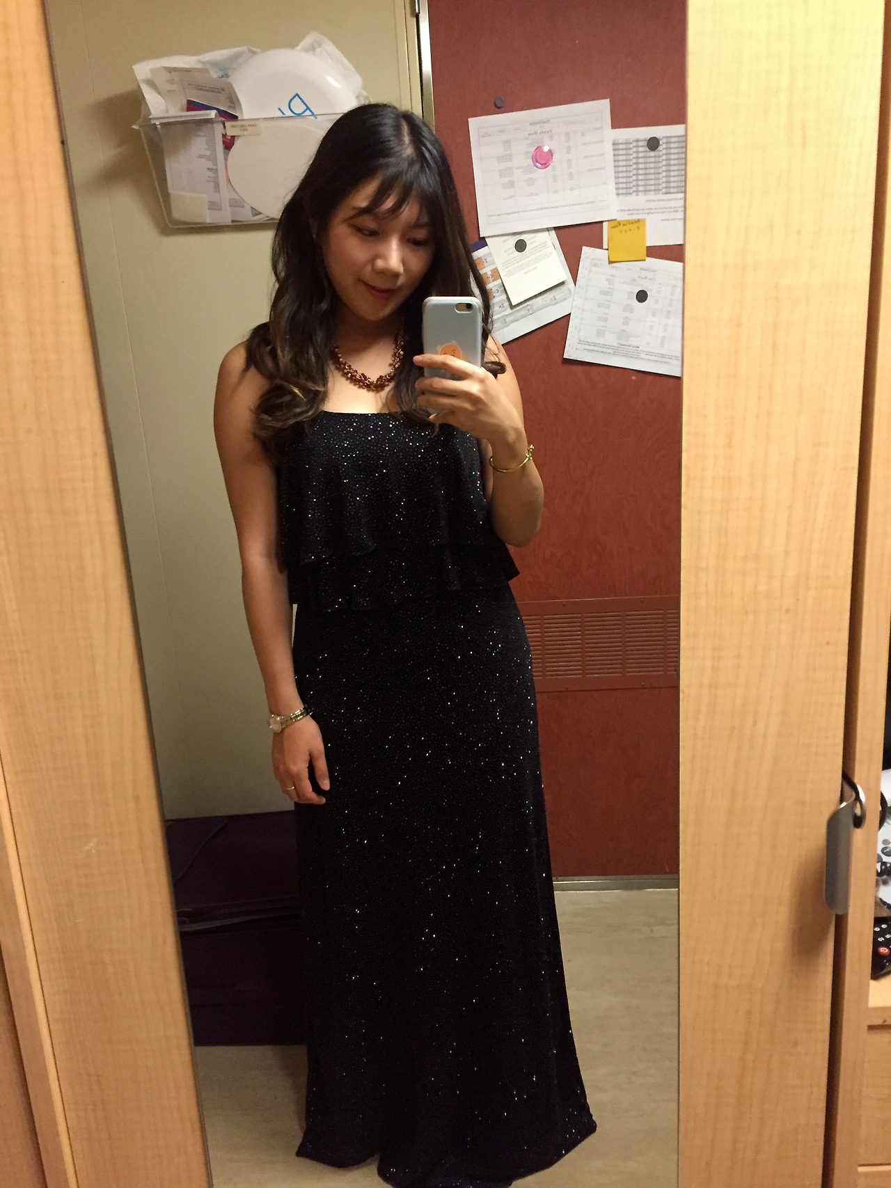 막판에 간신히 산 floor length 반짝이 드레스를 입고 크리스마스 디너파티에 갔다.