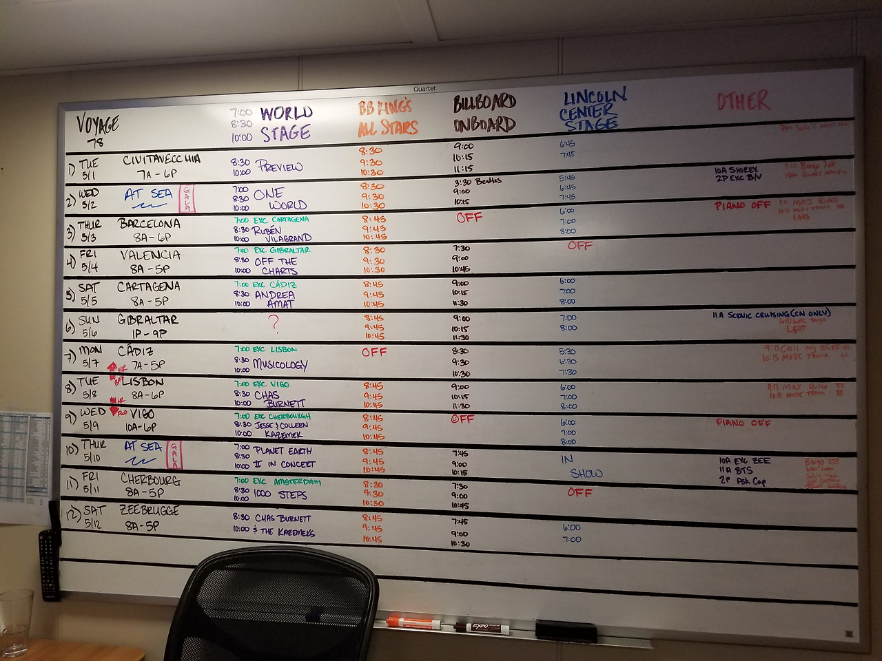 엔터테인먼트 팀 오피스엔 이 화이트보드에 스케줄이 매 크루즈마다 업데이트 됐다.