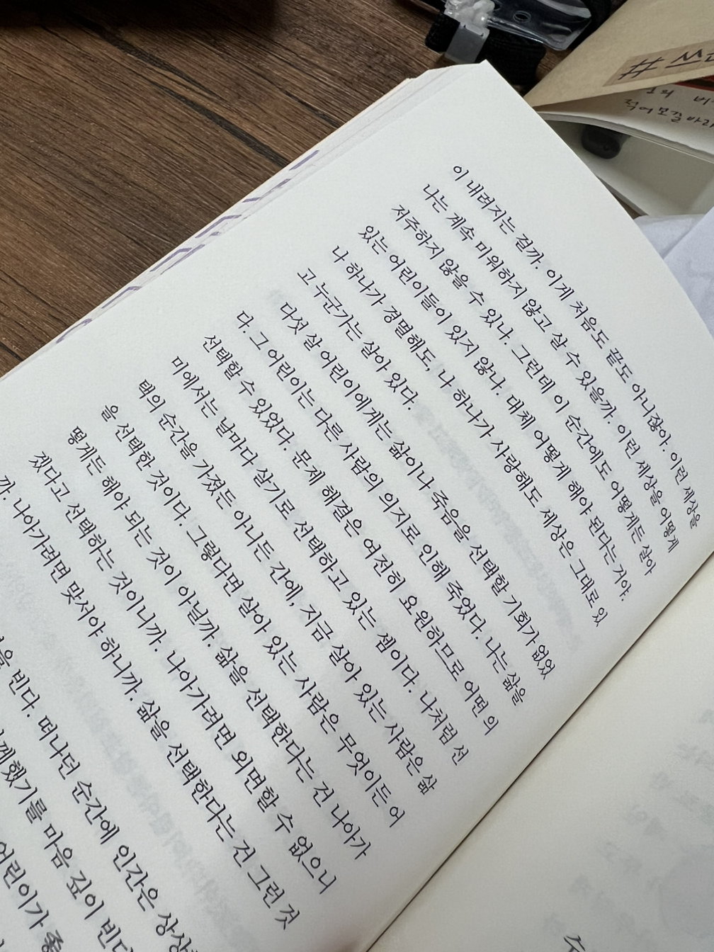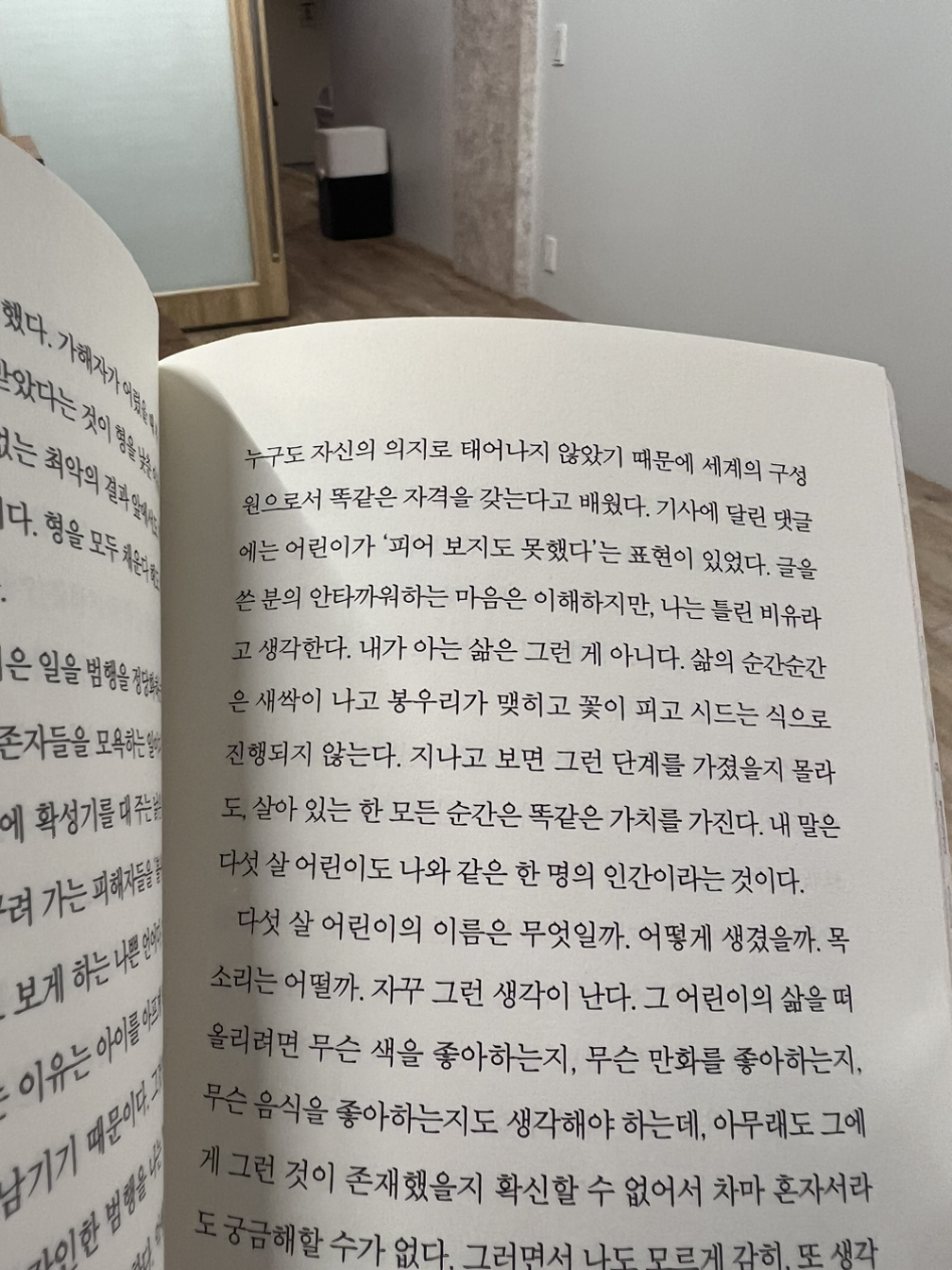 그래서 너무 멀리 와버린 것일지도 모르겠다, 어린이라는 세계에서. 자식이나 조카가 없는 나에게 그 세계는 바다 저 건너 건너의 섬 같다. 인스타그램 화면 속으로만 일상을 엿볼 수 있는 '인친'같은 요원함이 있다. 예상되는 책의 주제와 두께, 표지로 이 책을 가벼이 읽으려고 했던 마음을 반성한다. 최근에 만난 어떤 콘텐츠보다 마음이 울렁울렁거리고, 미끌미끌해졌다. 몇몇 이야기는 먼지 가득한 도시 속에서 빗길에 넘어졌다가 까진 무릎을 바라보는 느낌이었다. 인간은 나이를 먹을수록 지나간 일이 빠르게 지워지고, 무뎌진다. 나는 가끔 그런 뭉툭함은 현재와 미래에도 적용된다. 분명히 너무 맛난 음식이었는데 맛이 같아도 내 혀가 더 이상 그렇지 않을 때, 반가운 사람이 싫증 나질 때, 감사한 일에 그 마음이 빠르게 식고 다른 감정으로 채워질 때. 그럴 때, 어른이라는 지점에서 멀어지고 싶다.
