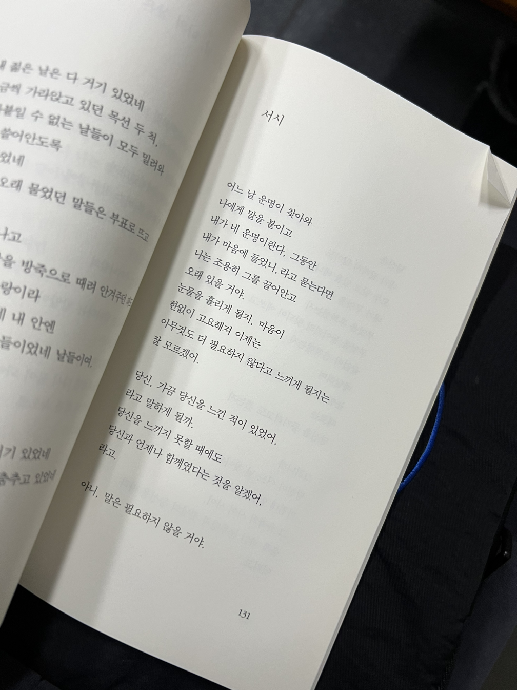 그래서 내게 시는 귀하다. 날이 갈수록 닿을 일이 없고 해가 갈수록 읽을 기회는 날아간다. 그래서 이 시집은 더할 나위없이 포근하게 읽혔다. 아주 얇고 날카로운 종잇장이 여러번 베인 듯한 기분이 들어도. 누적된 상처가 아물지 않은 채 건조한 겨울을 그대로 받아들이는 이야기들임에도. 시어로 자주 나오는 소재가 혀, 입술, 피와 같이 붉고 여린 것들이라 더 따갑게 느껴짐에도. 그럼에도 살아야지, 그럼에도 버텨야지, 그럼에도 잘 살아왔고 잘 버텨왔구나 하는 투명한 위로를 느꼈다. 특히 <서시>에서 그 감성이 제일 피어올랐다. 운명이 말을 걸어온다면 제일 지치고 힘든 순간 나에게로 다가온다면 나는 과연 어떤 반응을 보일 수 있을까, 이 시를 만난 이후로 감성과 상상을 곱해본다. 쉬이 대답할 자신이 없다. 대신 무언가를 내밀 것 같다. 아니 따뜻한 손을 건네고 눈을 바라볼 것 같다. 이것만으로도 나는 다시 충만해진다.