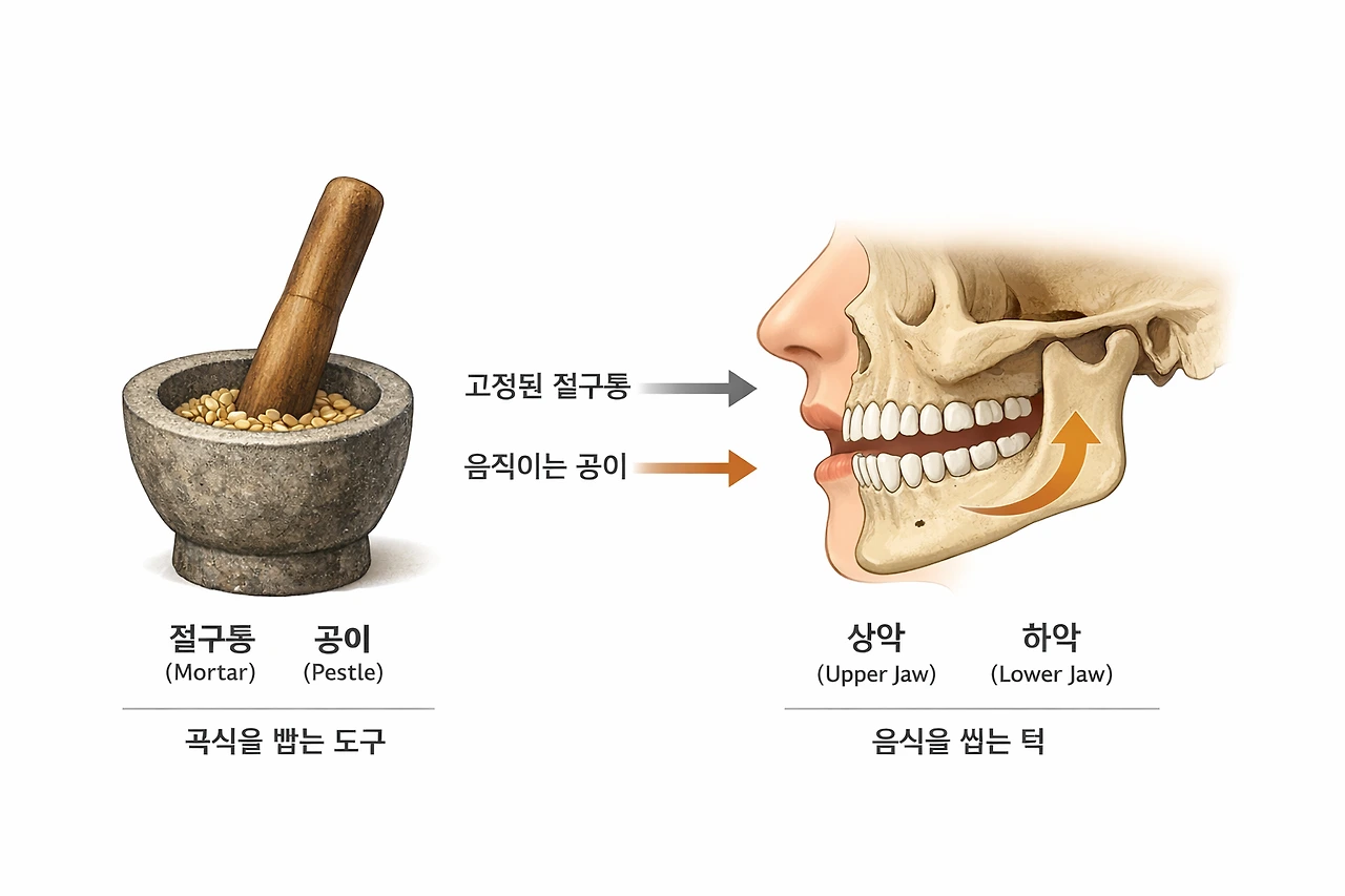 인간의 입은 어쩌면 이 절구를 뒤집어 놓은 구조에 가깝다. 위턱이 비교적 고정된 절구통의 역할을 하고 아래턱이 움직이는 공이의 역할을 맡는다. 치아는 그 안쪽 표면에 촘촘히 박힌 돌기처럼 실제로 음식에 닿아 그것을 자르고 갈아낸다. 앞니는 잘라내는 칼날에 가깝고, 송곳니는 먹이를 붙잡아 찢는 갈고리를 닮았다. 그리고 어금니는 절구 바닥의 넓은 면처럼 음식물을 눌러 부수고 정교하게 갈아낸다. 입이라는 동굴 안에서 각기 다른 모양의 도구들이 하나의 완벽한 절구 공정을 완성하는 셈이다.