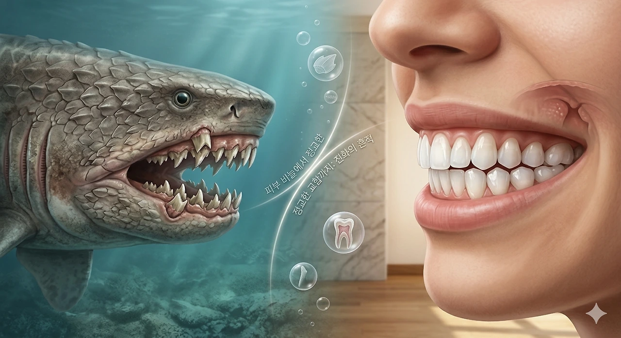 이에 대한 강력한 증거는 비늘의 구성 요소에서 발견된다. 고대 어류나 오늘날 상어의 비늘(방패비늘)을 현미경으로 들여다보면, 놀랍게도 우리 치아의 구조와 거의 일치한다. 비늘의 가장 겉면은 치아의 법랑질(Enamel)과 같은 성분으로 덮여 있고, 그 안쪽은 상아질(Dentin)과 신경이 지나는 수강(Pulp cavity)으로 이루어져 있다. 즉, 우리는 과거 몸을 감싸던 피부 갑옷의 일부를 입안으로 들여와 음식을 씹는 데 사용하고 있는 셈이다.