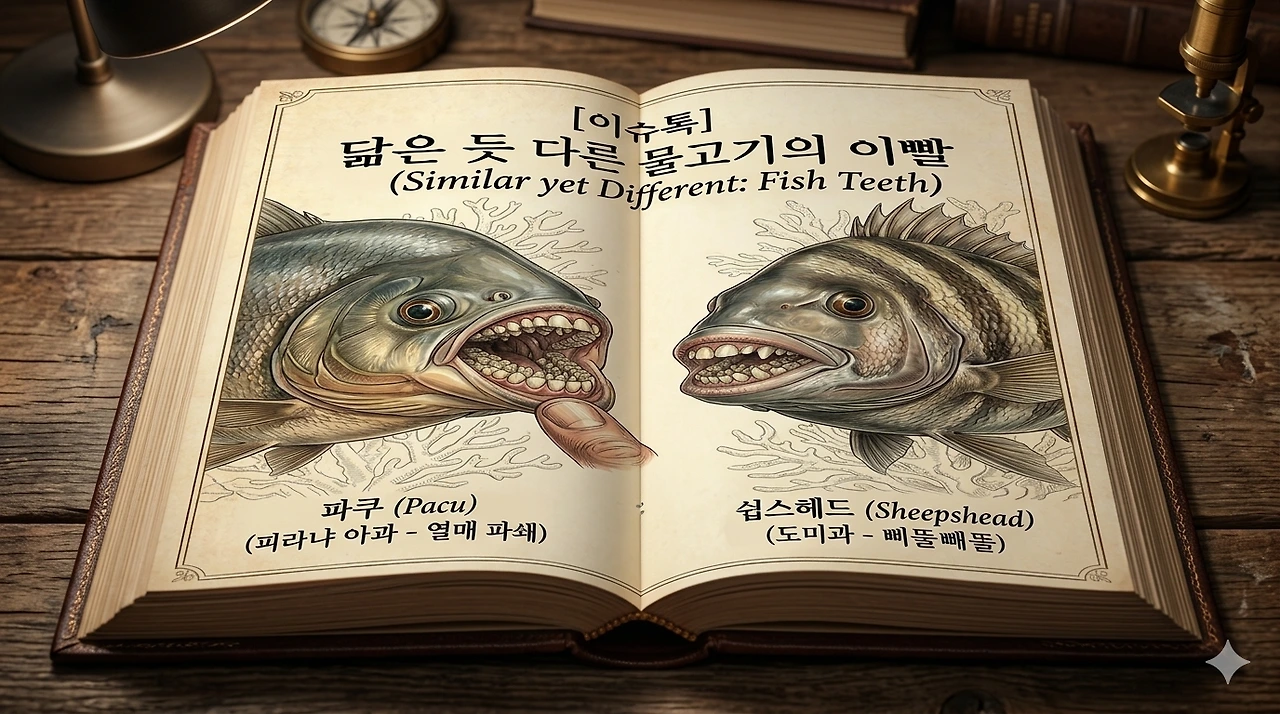 놀랍게도 바다와 강, 서로 다른 물속 세상에는 인간의 치열과 소름 끼칠 정도로 닮은 길을 걸어온 존재들이 있다. 북미 연안의 쉽스헤드(Sheepshead)와 아마존 강의 파쿠(Pacu)가 그 주인공이다. 이들은 인류와 유전적으로 아무런 접점이 없지만, 각자의 환경에서 생존하기 위해 인류의 하악 전치부와 어금니를 연상시키는 정교한 치아 구조를 구현해 냈다.