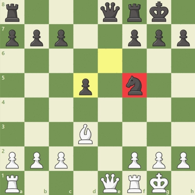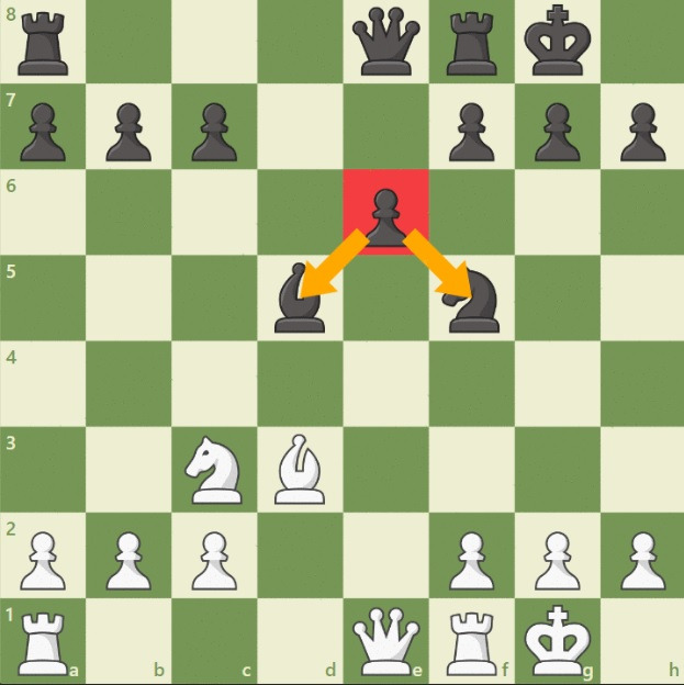 이미지에서 흑색 폰은 비숍과 나이트를 동시에 지키고 있습니다. 이에 백은 나이트로 흑비숍과 교환을 하였고, 다음 수에 지키는 기물이 없었던 흑나이트는 백비숍에 의해서 잡히고 맙니다.