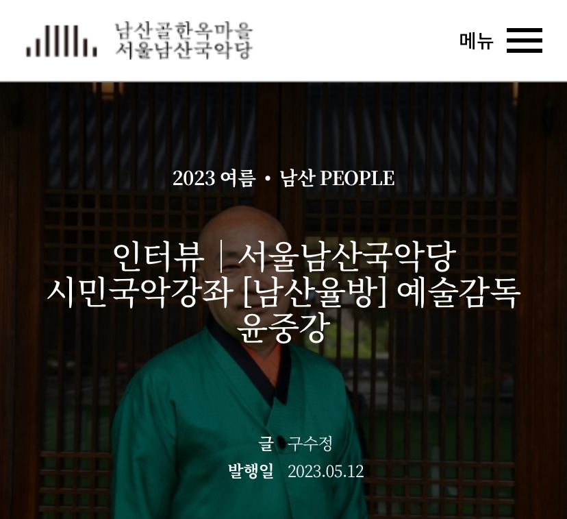 “……..“잠시 조선시대 남산골 ‘서생 윤(중강)씨’의 율방(律房)에 들러 거문고 한 자락 듣고 가시지요.” 보슬보슬 봄비가 처마 아래로 도르르 떨어지고 서울 남산의 나무들이 초록 물기를 잔뜩 머금은 4월 26일. 서울남산국악당이 시민국악강좌로 선보일 <남산 율방>의 윤중강 예술감독을 만났다. <남산 율방>의 기획 의도를 묻자 윤 감독은 순식간에 시간을 넘어 남산골의 ‘서생 윤씨’가 되어 있었다. “평론가는 어느 시대에나 있었다”라면서 “이렇게 비가 오는 날 나막신은 살 돈이 없어 짚신을 신고 다니면서도, 사랑방에는 가장 좋은 오동나무로 만든 거문고가 걸려 있는 선비가 되어 이 여정을 안내하는 게 내 역할”이라고 이야기한다.(생략)”