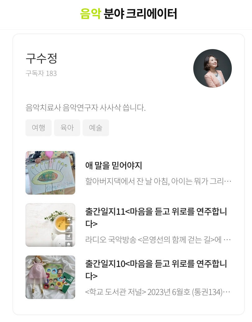 물론, 나는 사회에서 음악치료사이자 음악대학 학석사 및 음악교육학 석사와 음악학 박사 수료를 한 상태이므로 음악 전문가라 할 수 있다. 또한 논문이라던지 음악관련 일에 관해서 글을 쓰는 일이 많기 때문에 음악글은 내게 원고료를 받는 일거리다. 그래서 블로그 등에 올리지 않는다. 브런치 내에서도 음악 관련 전문지식을 소요하는 글이 거의 없다. 다만 최근 출간작에서 아쉽게 빠진 몇 꼭지를 묶어 올리는 것을 계기로 음악치료 및 음악에 대한 글을 구상하는 것 정도? 그러나 브런치스토리팀이 그것 까진 알 수 없지 않은가.