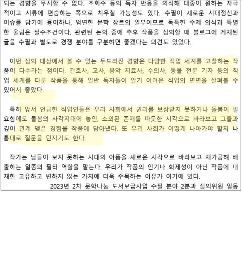 심의평을 보니 문학의 각 분야에 관해 깊이 생각해 볼만한 이야기들이 있어요. 제가 예전에 ‘에세이는 쓰레기다’라는 글제목으로 에세이(수필)에 관한 제 관점을 이야기 한 적이 있었어요. 심의평을 읽으면서 수필에 관한 생각도 한 걸음 나아가게 된 것 같습니다.