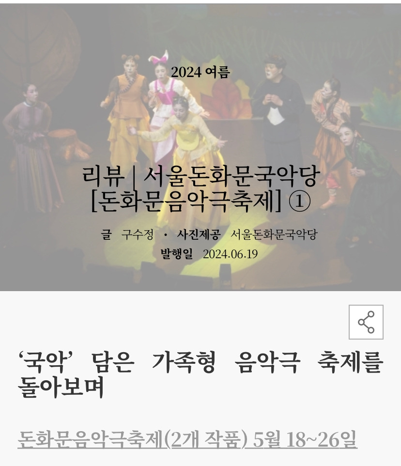 리뷰 | 서울돈화문국악당 [돈화문음악극축제] ① — 남산골한옥마을 서울남산국악당 통합홈페이 ‘국악’ 담은 가족형 음악극 축제를 돌아보며 돈화문음악극축제(2개 작품) 5월 18~26일 온통 푸른 5월이다. 하늘은 시리도록 파랗고 이팝나무 꽃송이가 날리는 이 아름다운 계절에 집 안에 웅크