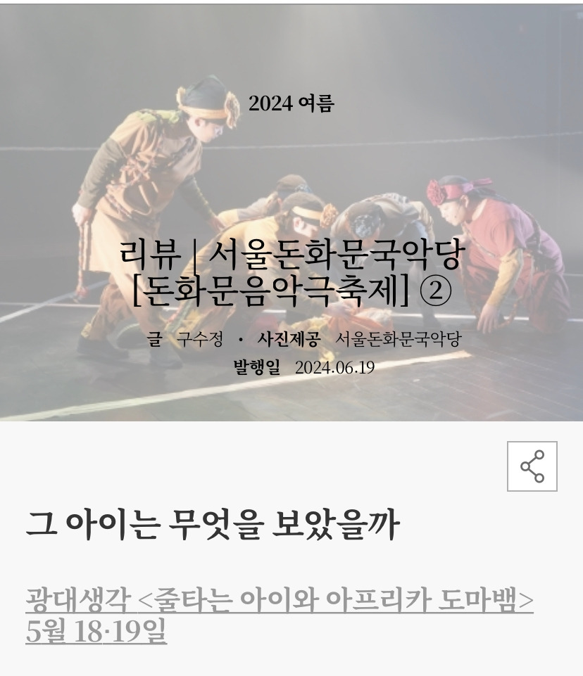2024년 돈화문음악극축제의 선정작 <줄 타는 아이와 아프리카도마뱀>은 이러한 광대놀음이 담긴 창작연희극이다. 5월 18일과 19일에 세 번의 공연으로 관객을 만났다….(이하 생략)