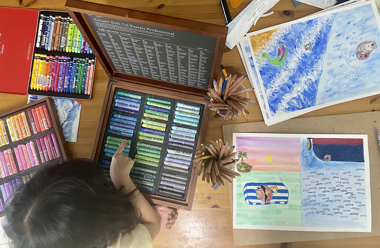 아이는 오일파스텔 120색을 품번에 맞게 순서대로 놓는 놀이를 좋아하는데 덕분에 색깔 이름을 나보다 더 많이 안다. 영어로 쓴 색깔 이름을 자꾸 잊어버리는데 아이한테 물어보면 다 기억한다. 황토색 오커(orchre)를 맨날 기억이 안 나서 물어본다. 파랑색 계열도 세심하게 다 기억하고 말해주는 아이. 정말 엄마보다 낫구나.