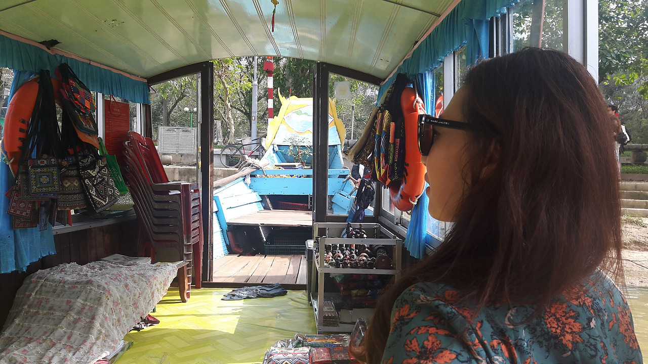 아주머니의 배는, 아니 강변에 정차된 지붕이 있는 배는 우리가 호텔에서 본 용맹한 용의 모습과는 조금 거리가 멀지만 꽤 큰 배였다. 생활을 배에서 하는 듯 배 뒷머리에 조그만 방이 있었고, 크고 작은 빨래가 널려 있다. 배 안으로 들어서자 정성스레 열을 맞춘 네 개의 이동식 의자가 눈에 띄었다. 우리가 이 배를 통째로 빌린 것이다. 우리가 이 정도야! 역시 자유여행의 묘미다.