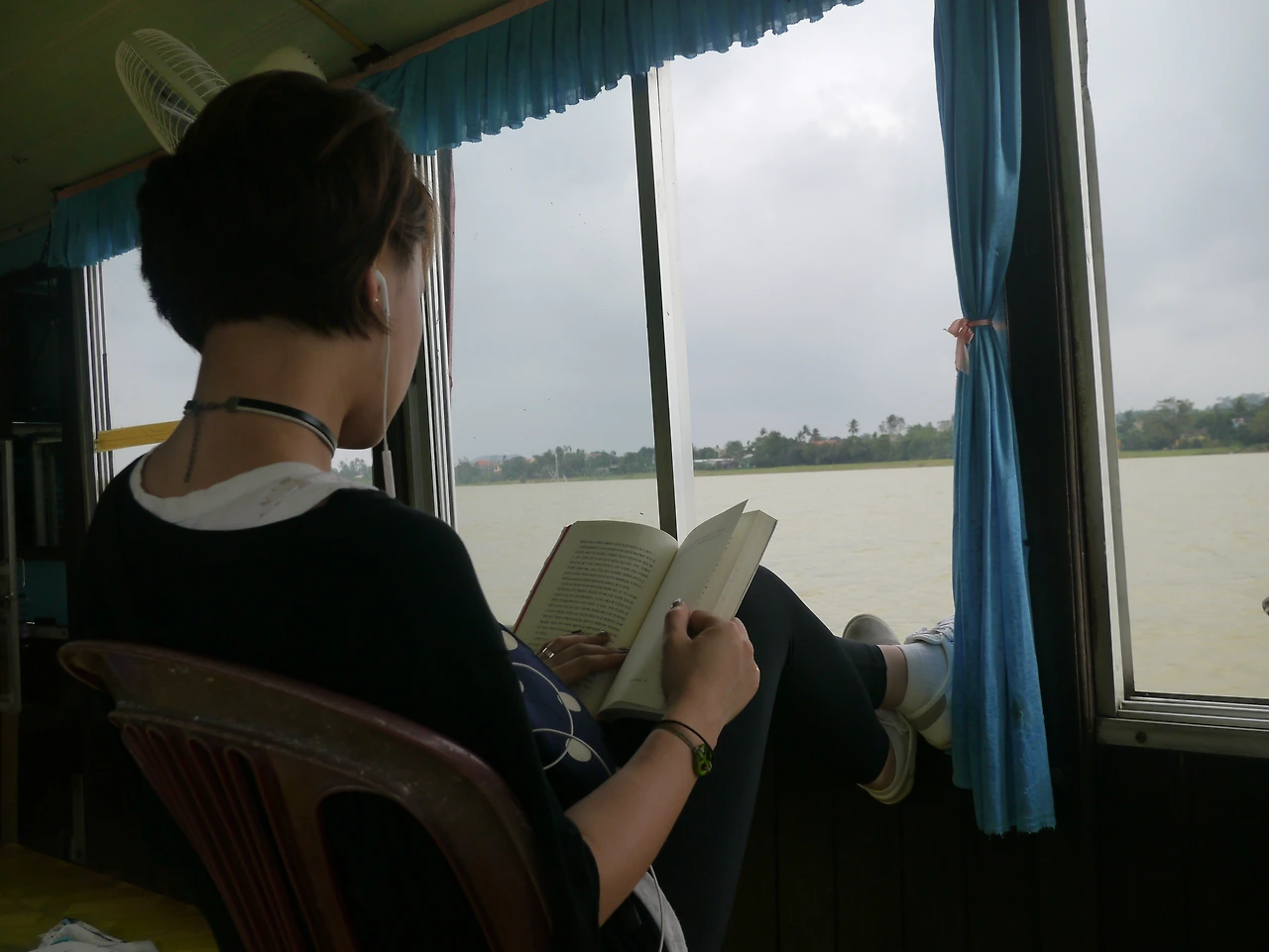 강을 거슬러 올라간다. 우릉 우르릉 달달달 엔진 소리가 정겹다. 찰싹찰싹 바로 옆에서 물결이 부딪치는 소리가 들린다. 누릿한 강물을 가르고 가끔 큰 파도를 만나 배가 울렁거리기도 했다. 누군가는 사진을 찍고, 책을 읽고, 멍하니 풍경을 바라보고 누구랄 것도 없이 각자의 의자에 앉아 자기만의 방식으로 이 뱃놀이를 즐긴다. 강둑에는 뿔이 길게 난 물소 떼가 목욕을 즐기고 있었고, 가끔 소꿉놀이를 하던 아이들이 우릴 향해 손을 흔든다. 먹구름 사이 달달거리는 엔진 소리만 빼면 참 고요한 풍경이다. 아주머니는 그 모습이 낯선 듯 안절부절못하지만 굳이 이 분위기를 깨지는 못하였다.