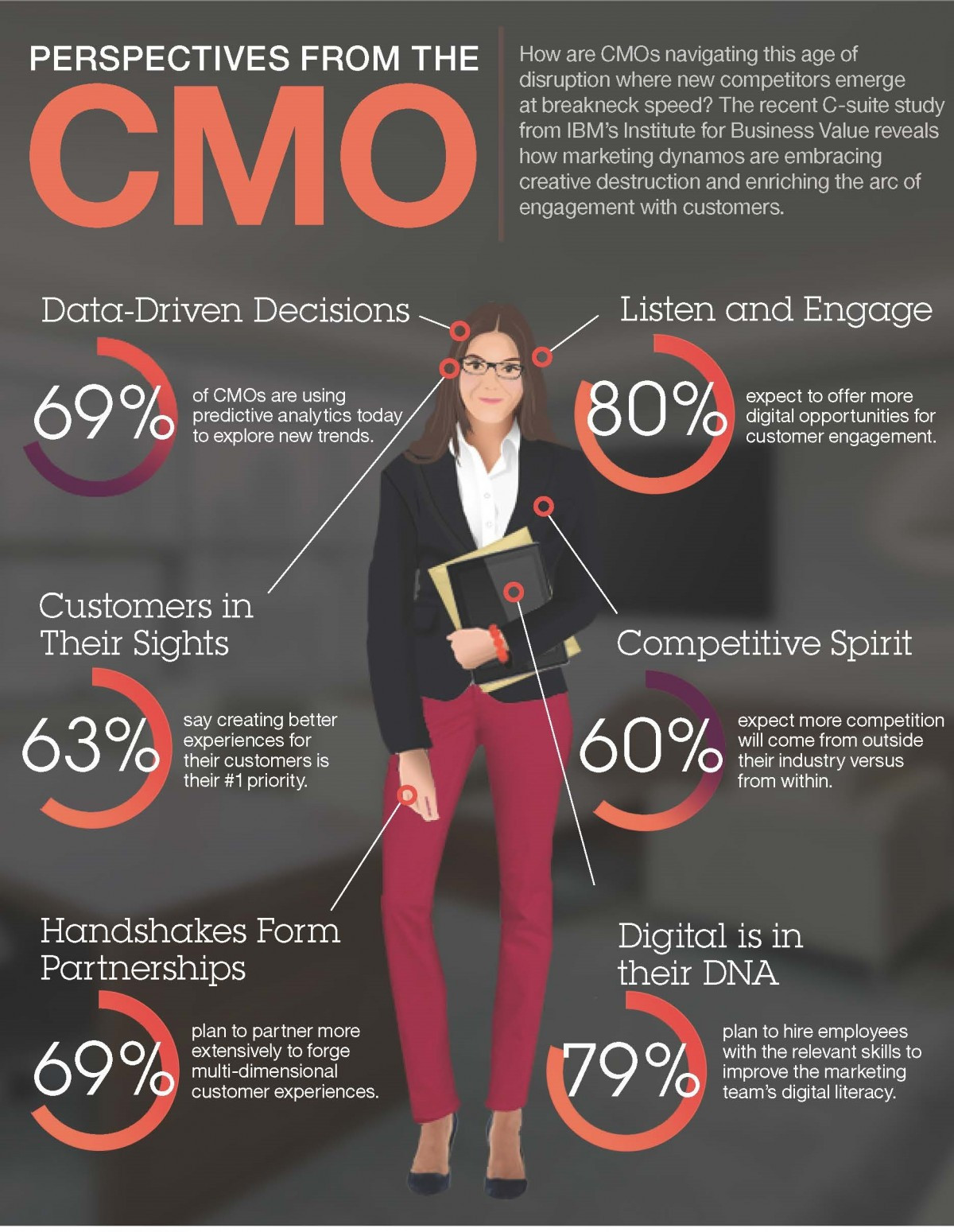 아래 이미지는 IBM에서 밝혀낸 요즈음 CMO의 정체를 설명한다. 예를 들어 CMO의 69퍼센트는 새로운 트렌드를 탐구하는데 예측적 분석방법을 사용하고, 데이터 기반의 의사결정을 하는 사람이다. 외부에서 더 큰 경쟁의 위협이 닥쳐올 것이라 예측하고 있고, 고객에게 더 나은 경험을 만들어 주는 것을 제 1의 과제로 삼고 있기도 한다.