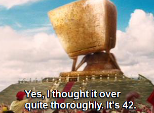 은하수를 여행하는 히치하이커를 위한 안내서에 보면 Deep Thought이 750만년간 계산 해 내 놓은 우주와 생명과 모든 것에 대한 궁극의 답이 42라고 한다. 아이러니하게도 Deep Thought은 자신이 계산해 낸 답이 정확하기는 하지만, 질문자들은 궁극의 질문이 무엇이었는지 모르고 있다고 확신하기 때문에, 질문을 알아내기 위한 더 강력한 컴퓨터로써 지구를 설계해 주었다. 지구는 살아있는 생물들과 함께 매트릭스 속에서 천만년 동안 답을 찾아가도록 설계되어 있었는데 8백만년째 에러가 발생하고 천만년 5분 전 우주초공간우회도로를 건설하기 위해 파괴된다. 결국 42 역시 올바른 답은 아니었던 것이 Deep Thought보다 더 나은 컴퓨팅 매트릭스인 지구가 8백만년째 발생한 에러로 인해 뽑아낸 질문에서 나온 오답인데다 지구는 파괴되었기 때문이다. 책을 읽어가다보면 궁극의 답과 궁극의 질문과 관련해 엎치락 뒤치락 사건들이 많았음이 밝혀지고, 우주는 근본적으로 결함이 있다는 대화도 나온다. 이 황당해 보이는 작품에서 내가 읽은 것은 인간은 답이 아니라 질문을 찾아야 하는 존재라는 것이다.
