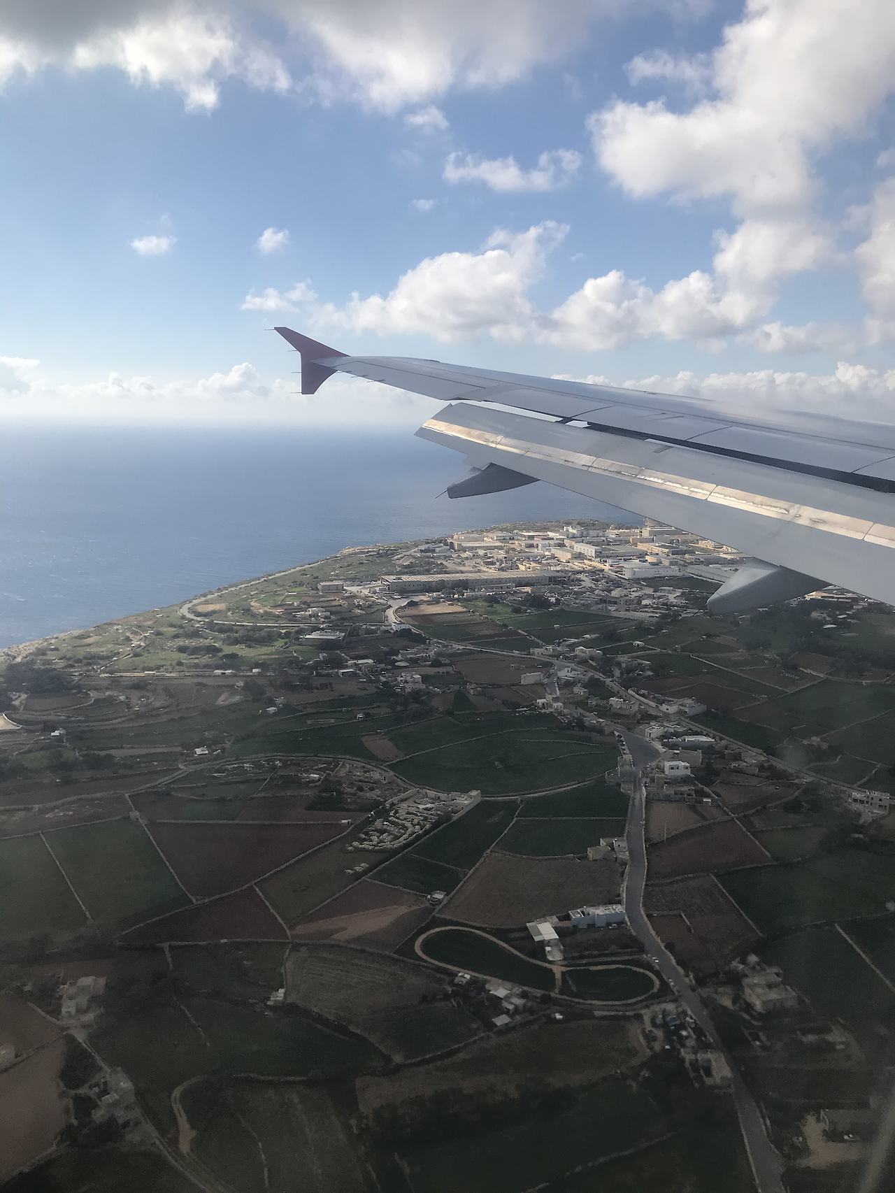 짜잔, 몰타 대륙이다 몰타섬이 바로 보일 때 찍은 사진이나 도시 시가지보다는 논밭 풍경이 많이 보이는데 몰타에서 출국할 때 사진을 찍으면 발레타, 세인트 줄리앙, 슬리에마 같은 도시사진을 중심으로 항공사진뷰를 남길 수 있다고 한다.