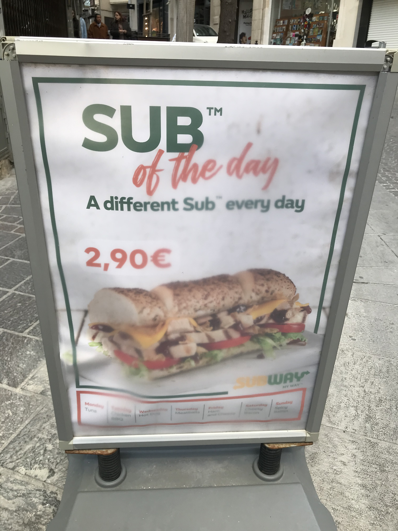 지나가는 서브웨이에서 사진을 찍었다. 어느 나라를 가던 그 나라의 물가를 판단하려면 프랜차이즈 음식점의 가격을 보고 물가를 가늠하는게 가장 빠르다. 서브웨이 기준 날짜별 프로모션 샌드위치가 2.9유로 한국돈으로 4천원정도라 합리적인 가격이라고 생각이 든다. 노말메뉴를 먹으면 이보단 훨씬 비싸겠지만, 맥도날드와 버거킹까지 구경해보고 내가 느낀 몰타 물가는 외식비는 우리나라에 비해 조금 비싼듯 하지만 적당한 프로모션이나 잘 찾아 다니면 우리나라와 비슷하거나 조금더 저렴한 식당도 있다는 것을 알게 되었음,