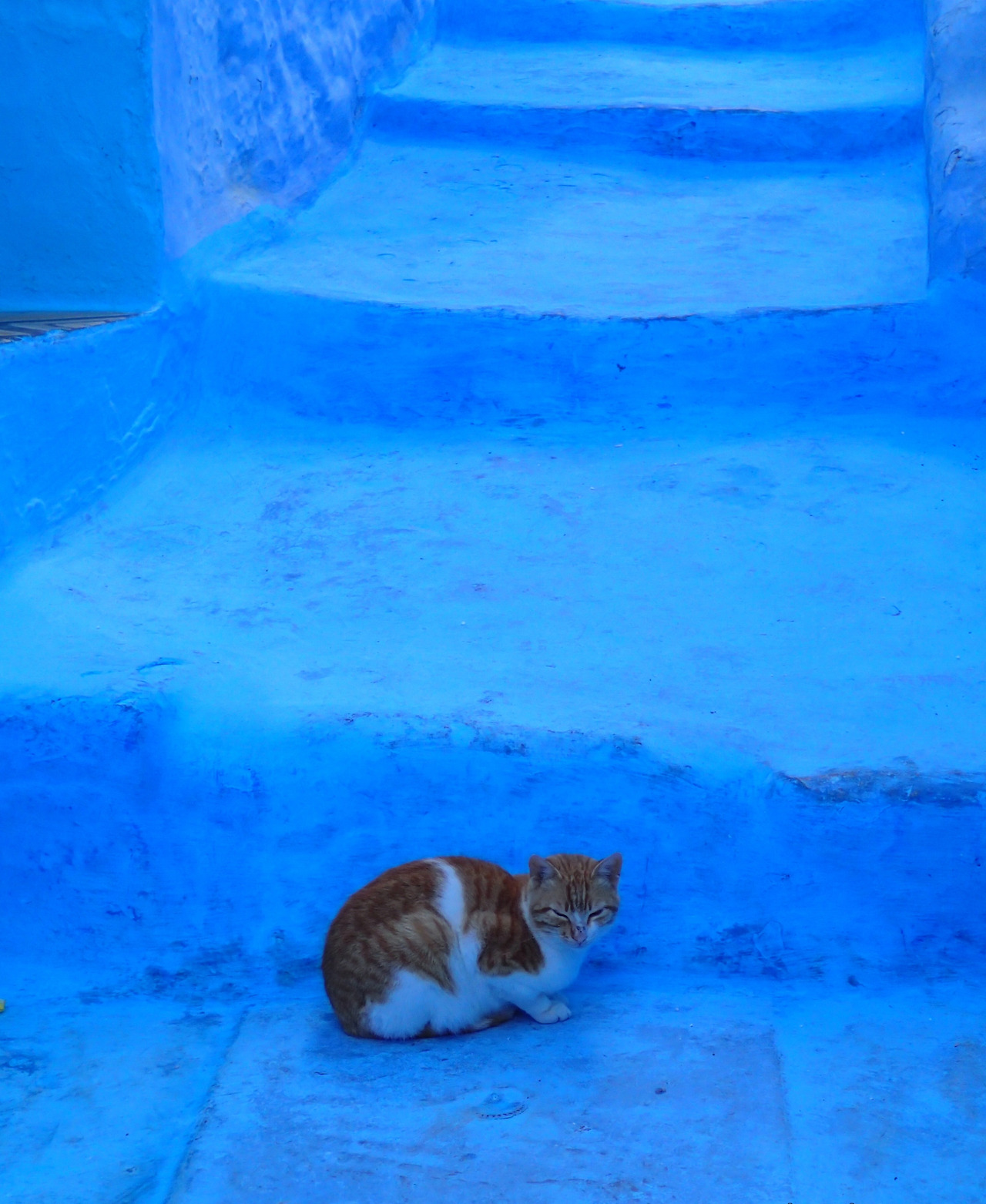 더 이상 신기할 건 없다고 생각했던 그 순간, 나는 믿을 수 없는 광경을 목격했다. 모로코의 마지막 여행지인 쉐프샤우엔(Chefchaouen)에서였다. 쉐프샤우엔은 모로코 북쪽에 위치한 작은 산동네로 온 동네가 파란색으로 물들어 있는 아름다운 곳이다. 내가 방문했던 날은 마침 이슬비가 촉촉하게 내리고 있었다. 너무도 가는 비라 우산을 쓰지 않고 맞으면서 돌아다니던 중이었다. 앞을 봐도 뒤를 봐도, 위를 봐도 아래를 봐도 파란 동네. 비에 젖어 더 운치 있다며 한 곳도 놓치지 않으려고 사진을 찍어 댔다. 온통 파란색에 취해 걷던 중, 비를 맞은 몸이 촉촉해지며 어느 순간 바닷속을 걷는 듯한 느낌이 들었다. 갑자기 현기증이 났고 몸이 떠오를 것 같이 휘청이다가 쓰러지려고 했다. 그렇게 주저앉는 순간 눈앞에 고양이가 보였다.