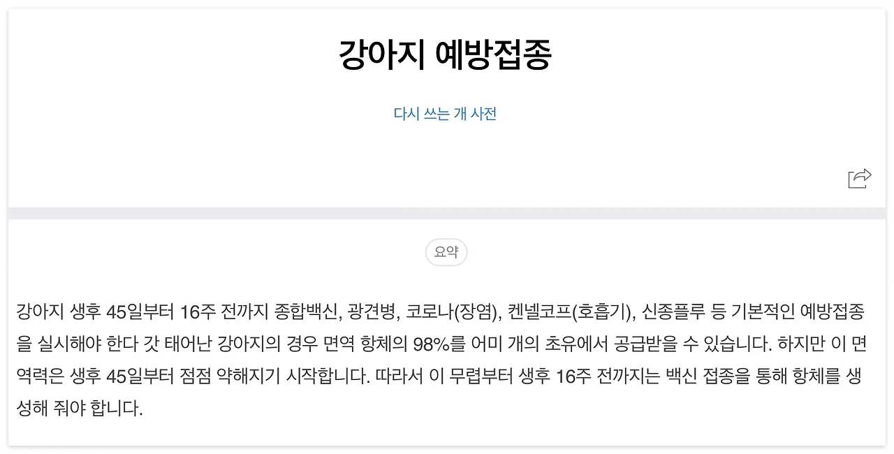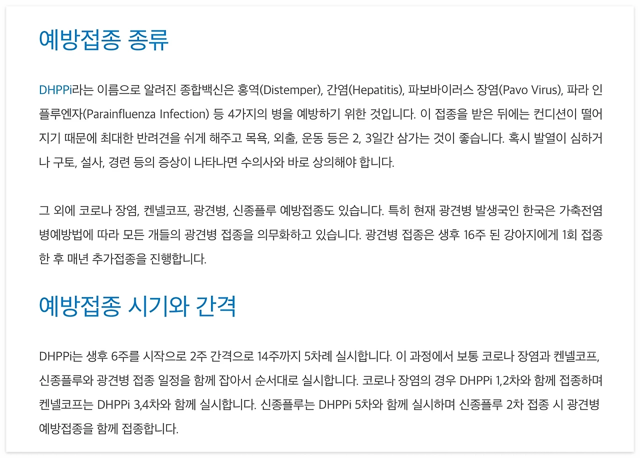 또 강아지는 신생아부터 유아기까지 단계별로 다양한 예방접종을 맞아야 하는데 생후 45일부터 16주 전까지 접종을 실시해야 하므로 여러 가지 자료를 검토하여 단계별로 하는 것이 좋다.