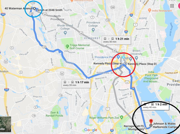 파란원 : 살던 집 / 빨간원 : 프로비던스 시내 / 검정원 : 대학원 및 컬리너리 캠퍼스