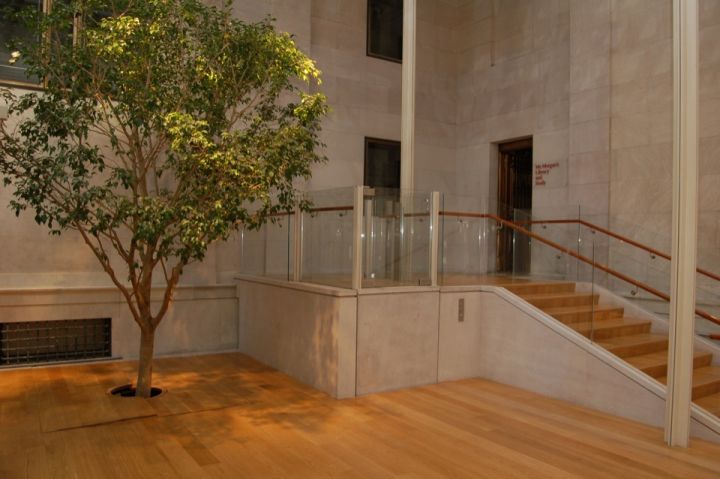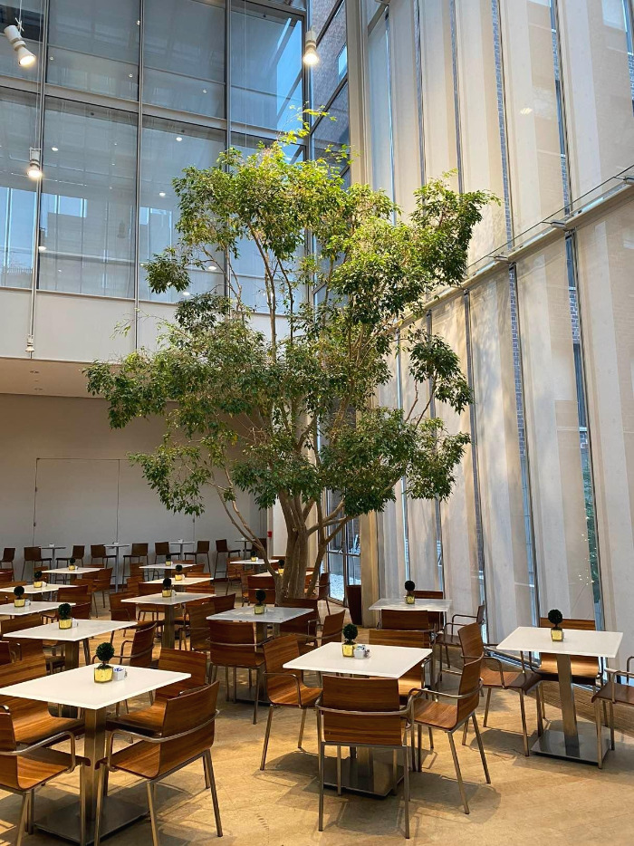 신관에 보면 카페를 중심으로 나무 2 그루가 있다. 미국에서 흔히 볼 수 있는 종류라고는 하는데 (이름이 잘 기억이 안 난다), 원래는 키가 모건의 그것들만큼 크지 않는다고 한다. 크기를 키우기 위해서 이 나무를 플로리다까지 보내서 오랜 시간 키워서 다시 가져와서 심었다고 하니 정성이 기가 막힐 정도다. 아직도 이 나무는 매일 아침 많은 낙엽을 떨어뜨리지만 하루가 지나면 또 다른 잎사귀가 피어나는 등 실제로 살아있는 나무이다.