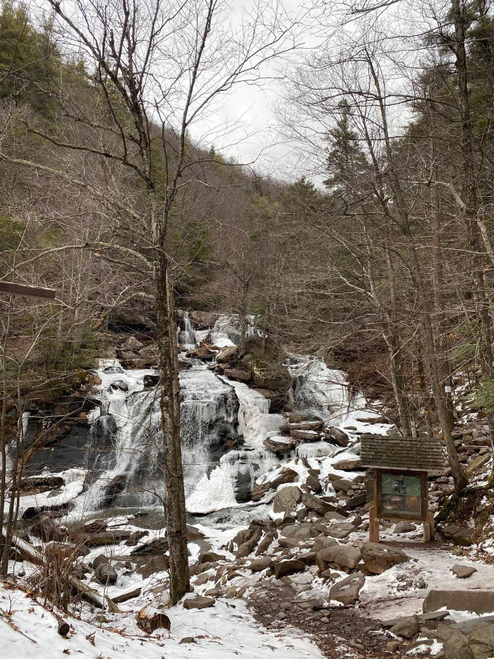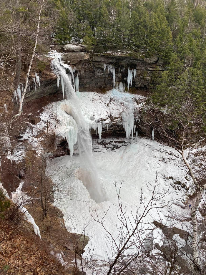 드라이브를 하다 보니 Kaaterskill Falls라는 관광지 표시 (표지판에 갈색 배경인 것은 한국과 같다)가 보여 가보기로 결정하고, 차로는 접근이 불가능해 보여 등반하는 동안 주차가 가능한 주차장을 찾아서 접근을 하기로 했다. 막상 차에서 내려보니 쌓인 눈에 전날 내린 비가 그대로 얼어붙어서 매우 미끄러웠다. 등산화는 신었지만 아이젠이 없어서 포기하려다가 둘 다 천천히 조심스럽게 다녀와보기로 했다. 폭포 하단부까지는 0.7 마일 정도라 그리 멀지 않은 거리지만 길 상태가 매우 좋지 않아서 0.3 마일 정도 거리의 전망대까지만 가기로 했다. 폭포가 가까워질수록 커지는 물소리에 폭포가 작지 않고 웅장한 것이라는 것을 직감할 수 있었다. 전망대에 도달하자 엄청난 경관에 입을 다물수가 없었다. 더욱 웅장한 폭포도 많이 봤지만 설경과 더불어 거대한 빙벽과 함께 하단부에 물이 얼어붙어 빚어낸 겨울 경관은 그야말로 겨울왕국 그 자체였다. 기대하지 않았던 정말 멋진 광경에 아내도 나도 한참을 넋을 놓고 폭포를 바라봤다. 일상생활에서 쌓인 스트레스가 절로 날아가는 시원함을 느낄 수 있는 멋진 경험이었다.