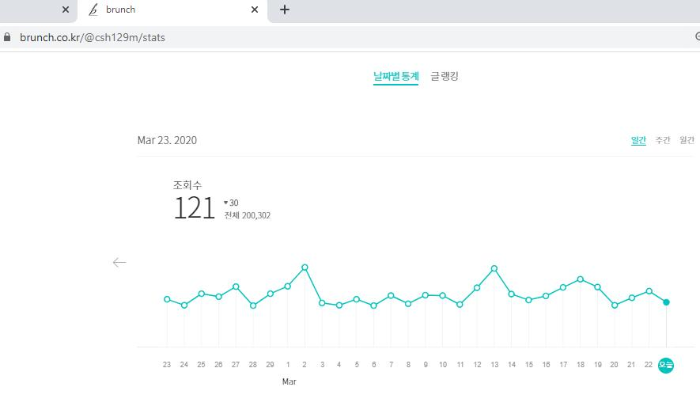 읽어주신이가 많이 없어서 속상하기도 했고, 한 글은 10만 명이 넘는 분들이 읽어주신 글이 되어주기도 했다. 어제는 내 브런치에 다녀간 분들이 20만 명이 넘어간 날이기도 했다 (물론 대부분 다음 포털에서 글을 읽고 구독은 하지 않고 들러 가시는 분들이 대부분이셨다).