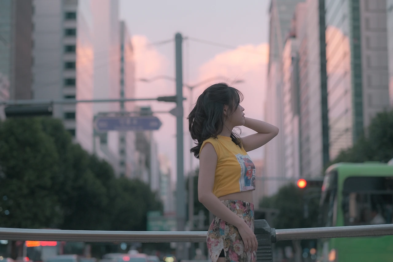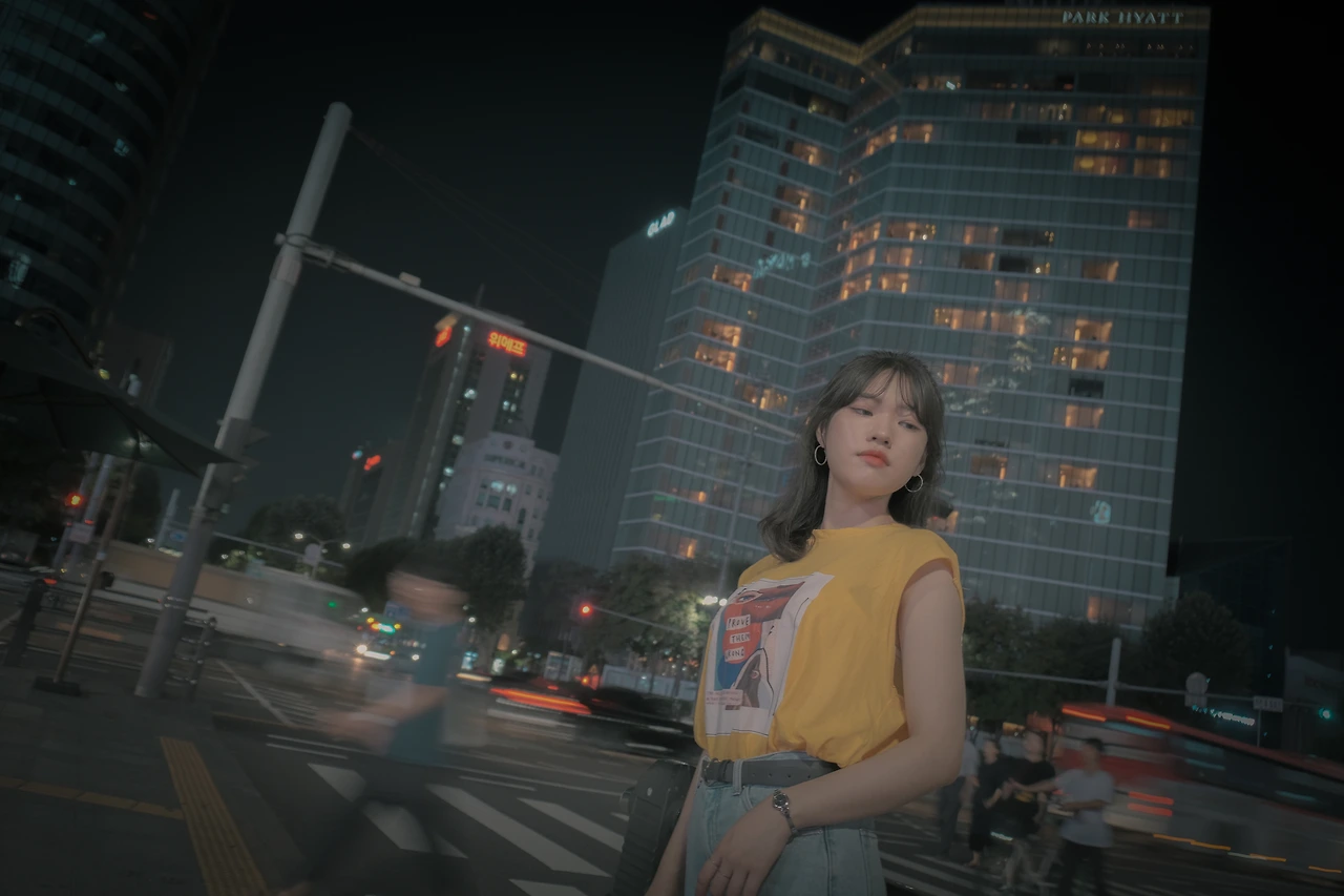이야기한 조건을 모두 충족하는 곳이 여의도와 테헤란로였는데, 교통섬이 도로 한복판을 관통하여 지나가는 차량들을 배경으로 활용하기에도 용이한 테헤란로를 자연스럽게 고르게 되었다. 야경을 많이 찍고 다닌 나로서는 고층건물 숲 사이로 일직선으로 올곧게 뻗어가는 테헤란로가 다소 그물망처럼 되어 있는 여의도의 빌딩숲 사이사이의 길보다 매력적으로 다가왔을지도 모르겠다. 그러면 이제 정한 무대 위에서 다소 차갑고도 메마른 감정을 '잘 드러내 줄 수 있는 사람'이자 동시에 '그 때 꿈만 같았던 그 도시를 잃어버린 아련함'을 연기해줄 수 있는 사람이 필요했다. 대숲사진가가 알고 있는 네트워크에서 이것을 같이 도전해줄 수 있는 모델은 단 한명이었다고 생각했다. 큰 고민 없이 김콩에게 카톡을 했고 그렇게 테헤란로에서의 촬영이 성사 됐다.