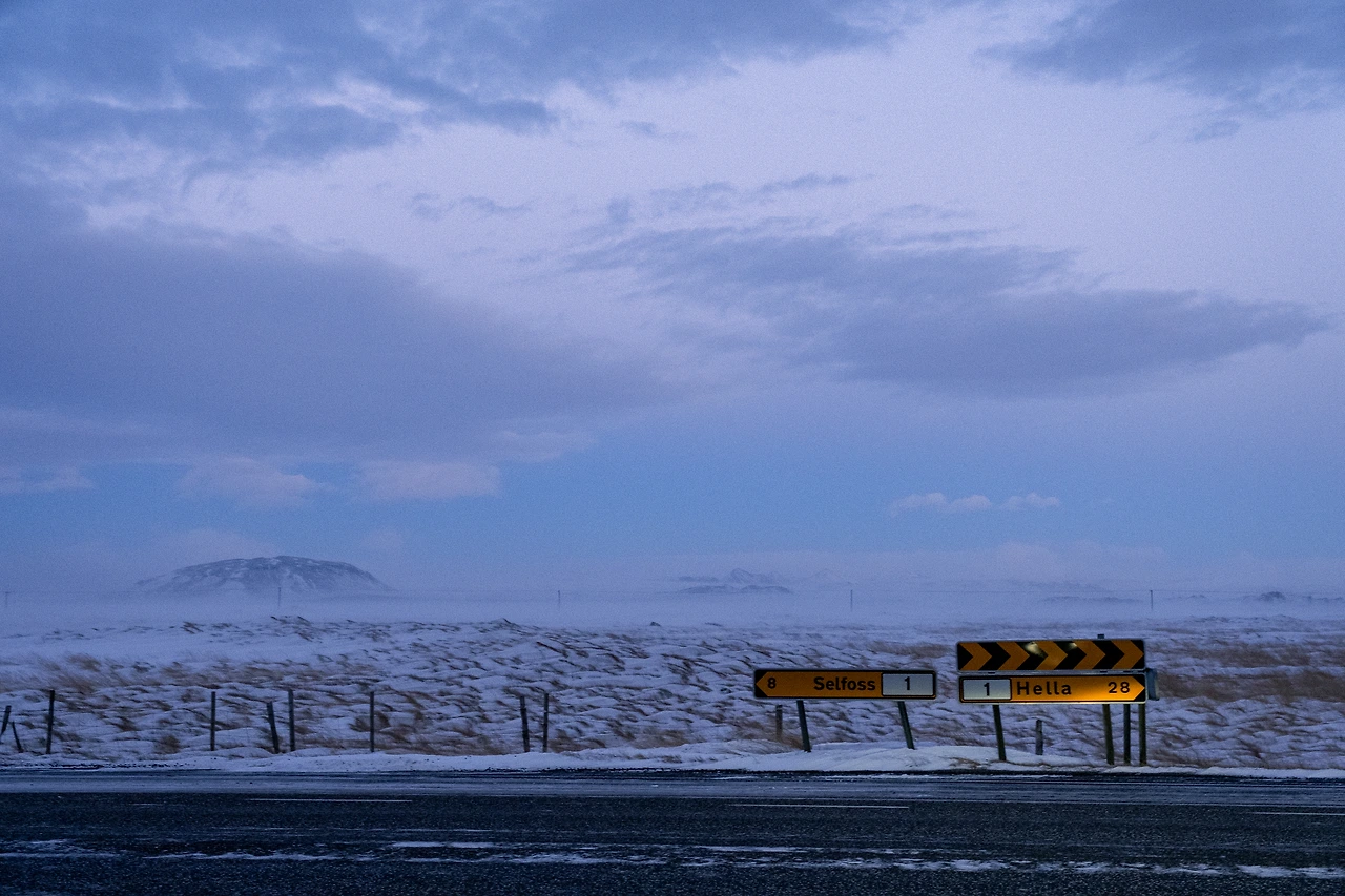 레이캬비크에서 회픈으로 가기까지의 가는 길에 그나마 지날만한 도시라고 한다면 셀포스와 헬라, 비크이뮈르달 (보통 비크라고 부른다) 등이 있다. 부지런히 남부를 지나가면서 그 와중 틈틈이 갓길에 세워가며 풍경도 즐겨보기로 마음먹었다. 물론 겨울의 아이슬란드는 여행자에게 절대 갖고 있는 모든 것을 보여주지 않는다. 사람이 아닌 자연 그 자체에게 큰 환영을 받지 못할 것이라는 사실 정도는 각오하며 거센 바람과 흩날리는 눈을 헤치며 1번 국도를 나아간다.