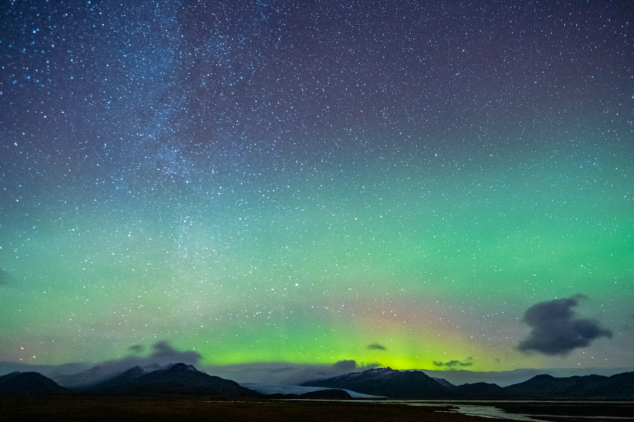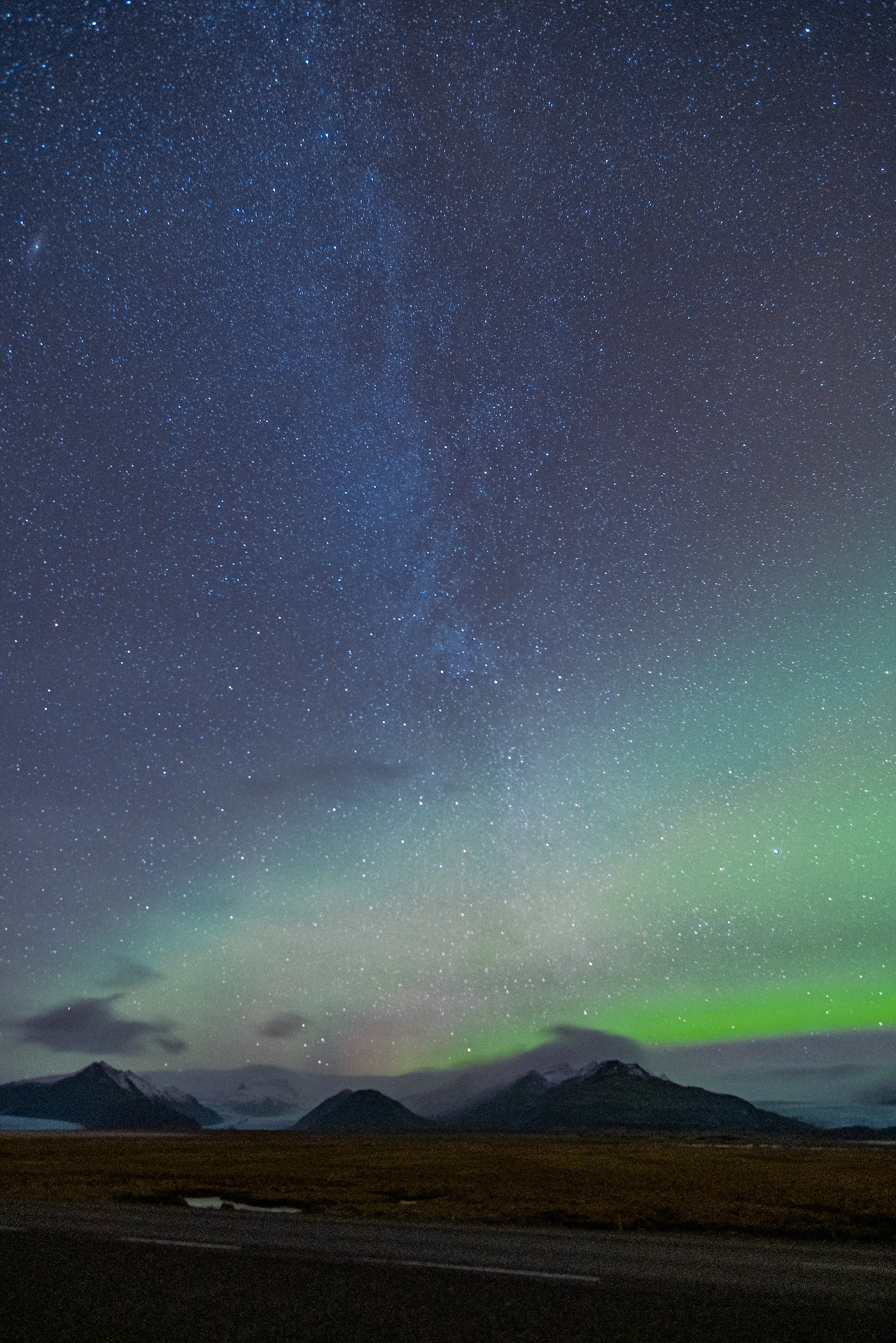 이번에 보게 된 것은 1번 국도의 옆으로 펼쳐진 남부의 광활한 평야와, 그 뒤를 감싸고 있던 스카프타펠 만년설, 그리고 그 위로 펼쳐진 은하수와 오로라가 수놓은 밤하늘이었다. 오로라에 주목하고 있었지만 별들과 은하수도 정말 쏟아질 듯 무수한 점들로 하늘에 박힌 채 밝게 빛나고 있었다. 그 은하수의 뻗어나감과 오로라에 집중하여 세로 구도로 한 장을 기록했다. 그리고 마지막 한 장으로 횡으로 펼쳐진 오로라의 무한한 뻗어나감과 은하수를 동시에 담았다. 지평선은 최대한 간결하게, 그리고 한 장의 그림 같은 저 밤하늘은 가능한 한 넓은 구도로 잡아넣었다. 한국에서 별을 보러 다니던 여행에서도 내가 좋아하던 구도 중 하나였다.
