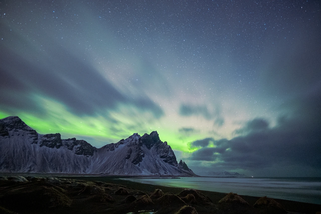 베스트라호른은 내 생각보다 훨씬 더 웅장했고 날카롭게 솟아 있었다. 들고 갔던 삼양의 초광각렌즈가 '화각이 너무 좁다'라고 느껴본 적은 아마 거의 처음이었던 것 같다. 사진에 담긴 것보다도 훨씬 더 높고 험준한 인상이었다. 산을 모두 담아내면서 동시에 검은 모래와 바다까지 함께 담으려 하다 보니 구도에서 많은 타협을 봐야 했다. 그렇지만 동시에 오로라 위에 무수히 빛나고 있는 별들도 잊어서는 안 됐다. 아주 길지는 않은 시간이었지만 나는 빙하 이상의 훨씬 더 벅차오르는 재회의 감정을 그렇게 이곳에서 만끽했다.