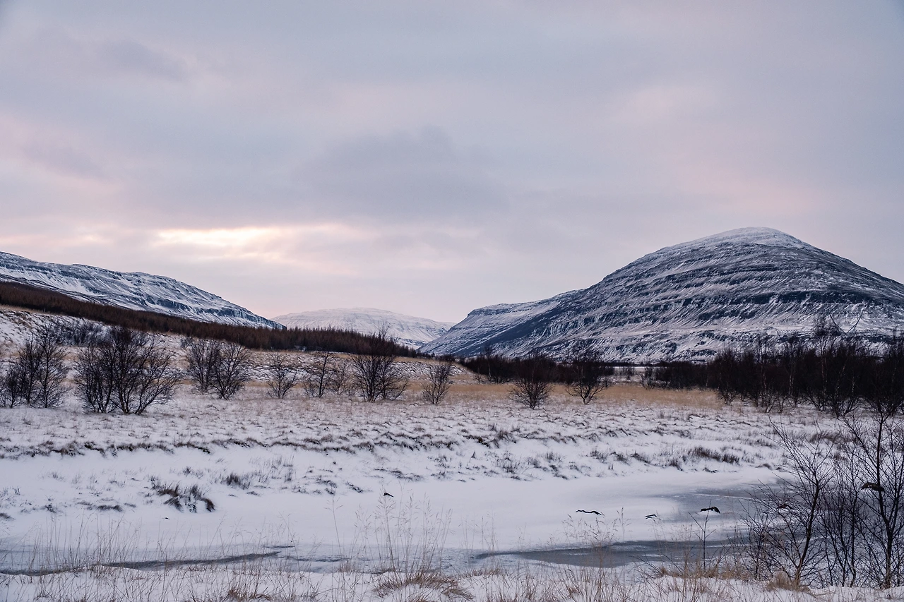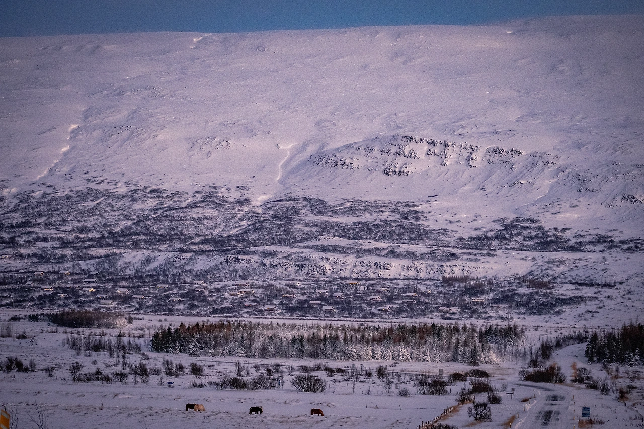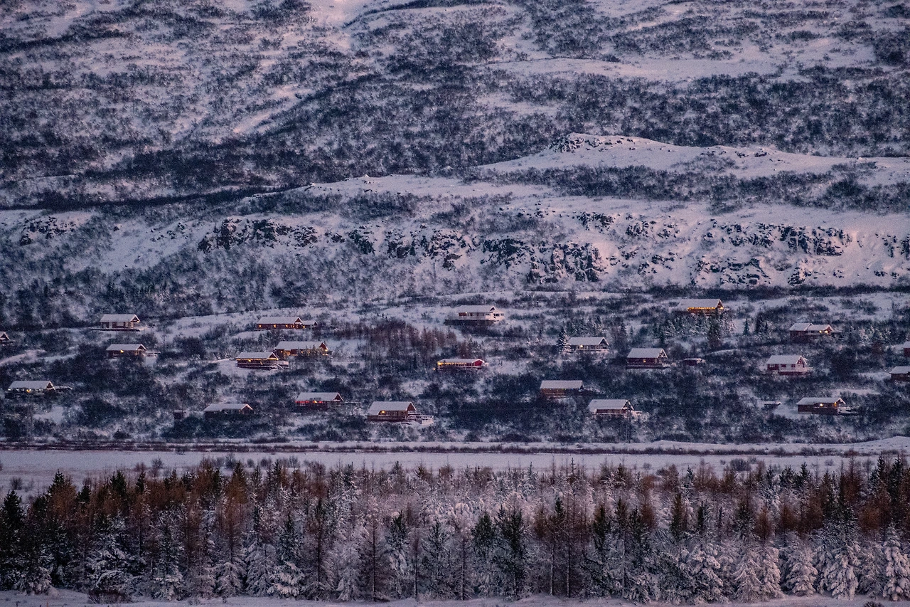 라가르플요트가 겨울잠을 자고 있던 고요한 요람을 다 돌아본 채 에이일스타디르로 다시 돌아온 것은 땅거미가 질 무렵이었다. 마을 진입로였기에 평소였다면 위험했겠지만 아무도 없는 도로 위였기 때문에 잠시 비상등을 켜고 차를 세웠다. 아무도 없는 눈밭 위를 거닐 수 있다는 것은 위험한 만큼 그 반대의 장점도 존재했다. 오로지 나 혼자 만끽할 수 있고 기록할 수 있다는 그 특별함의 감정. 그 감정의 희열을 마음껏 느끼며 아마도 해 떠 있을 때 이곳에서 찍는 것으로는 마지막이 될 사진을 찍었다.