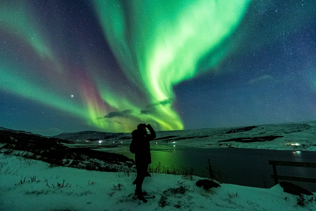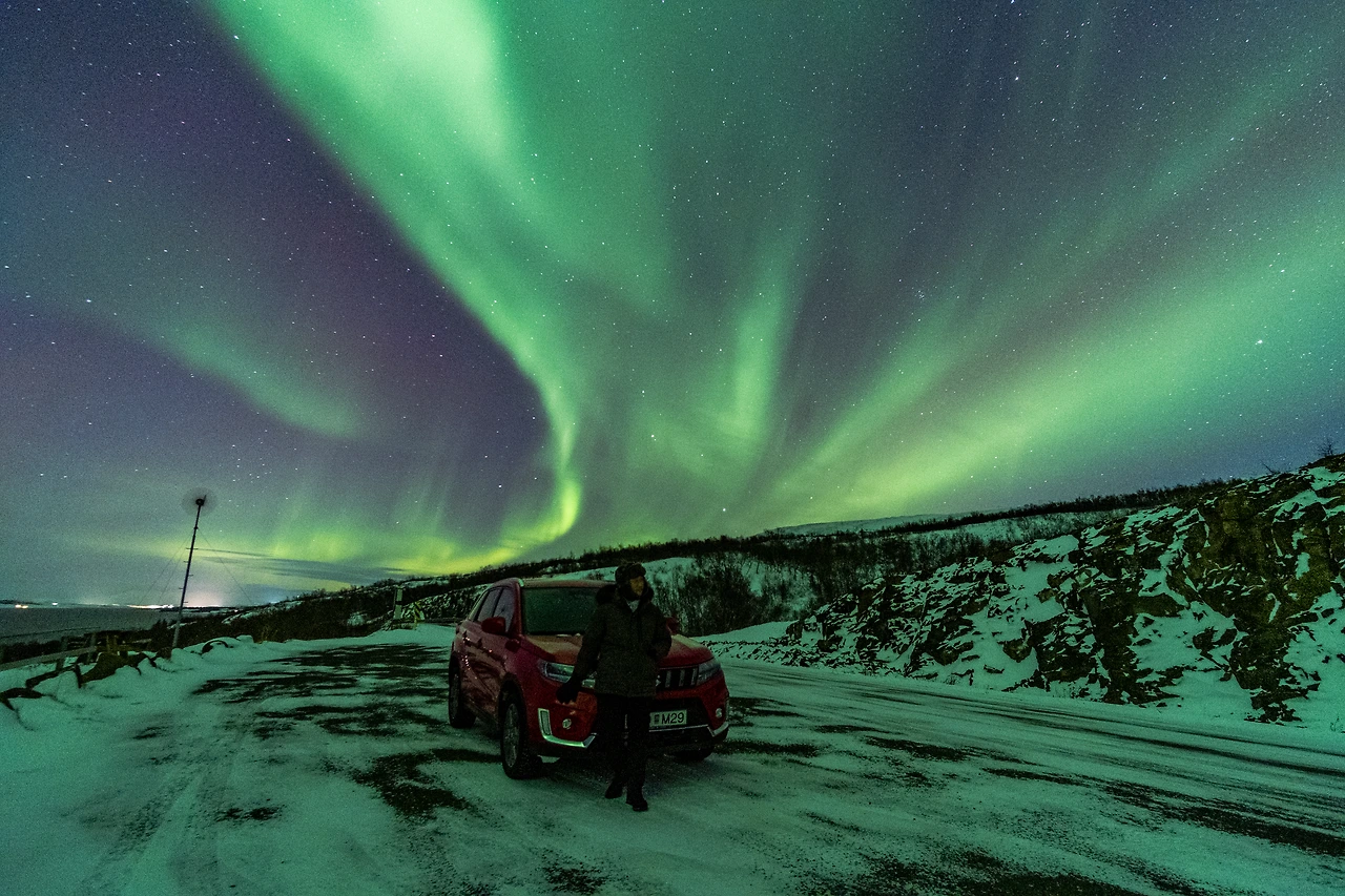 그래서 잠시 뒤편으로 카메라를 돌려 지금까지 여행의 약 절반을 해쳐 나온 나 자신과 나의 유일한 동행 자동차와 함께 사진을 찍었다. 별과 은하수 아래에서 장노출로 사람을 몇 번 찍어봤기에 그 정도야 능숙했다. 뒤편의 오로라가 약간의 붉은 빛깔 오로라가 더해져 있었고 끄트머리의 꼬리가 더 격렬하게 요동치는 모습이 더해져 한층 신비로움을 더했다.