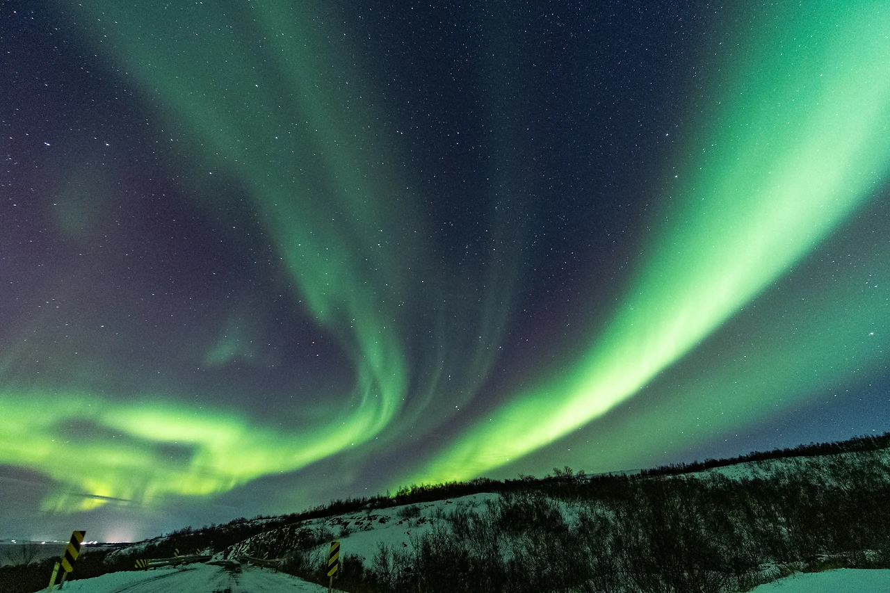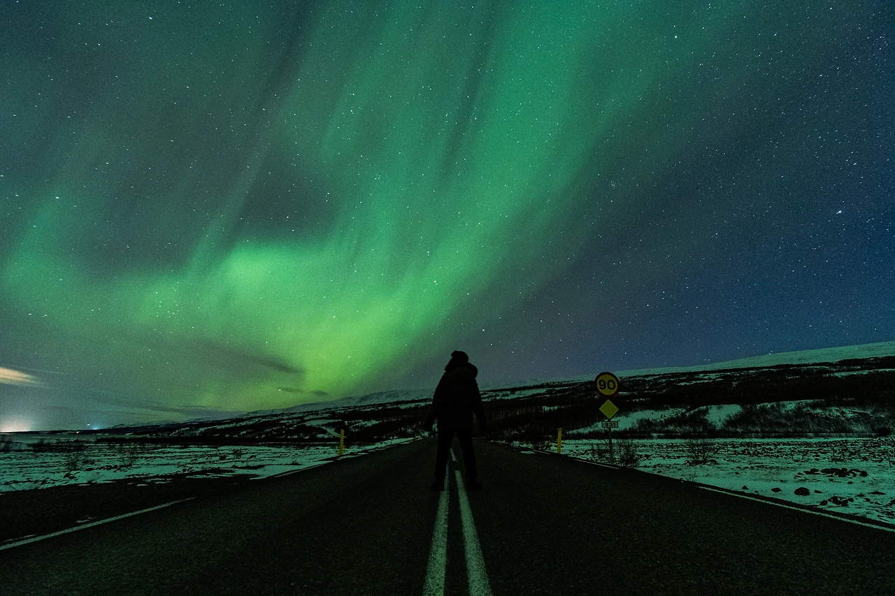 다리 바로 앞 국도 한복판에 삼각대와 함께 섰다. 이 오로라를 만났을 때 꼭 하고 싶은 사진이 있었는데, 바로 아무도 다니지 않는 심야의 차도 한복판에 나 혼자 서있는 채 오로라와 함께 찍는 것이었다. 특별한 이유는 없었지만 이 구도를 굉장히 오래전부터 꿈꾸어 왔었다.